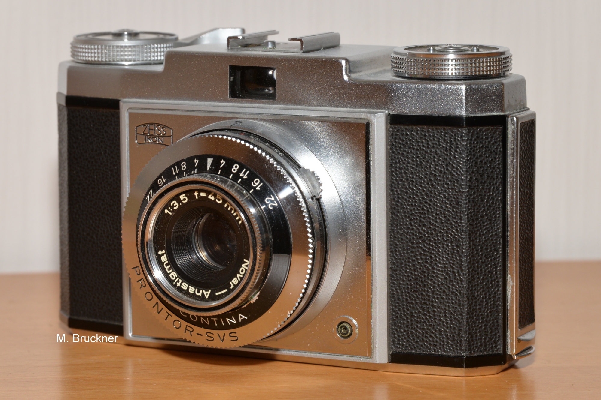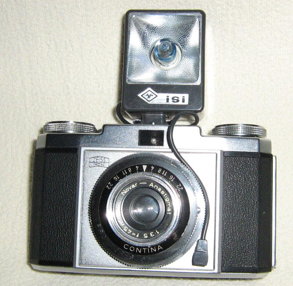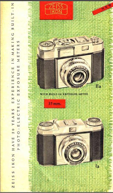 Hier stelle ich meine Contina Ia aus dem Jahre 1956 vor. Mit dem Ende der Klappkameras stellte Zeiss Ikon auf der Fotokina 1955 eine neue Generation der mittlerweile beliebten Sucherkameras vor. Die Konstruktion mit Schnelltransporthebel und gleichzeitiger Verschlussspannung entsprach dem damaliger Standards die vor allem Agfa mit der Silette gesetzt hatte. Die Gehäuseform blieb beim bewährten "Brikett" , Bildzähler und Filmmerkscheibe waren gut sichtbar auf der Oberseite integriert. Die Frontplatte war bei der ersten Ausführung noch gestreift, der Blitzanschluss ragte seitlich schräg aus dem Objektivtubus wie diese Prospektseite zeigt:
