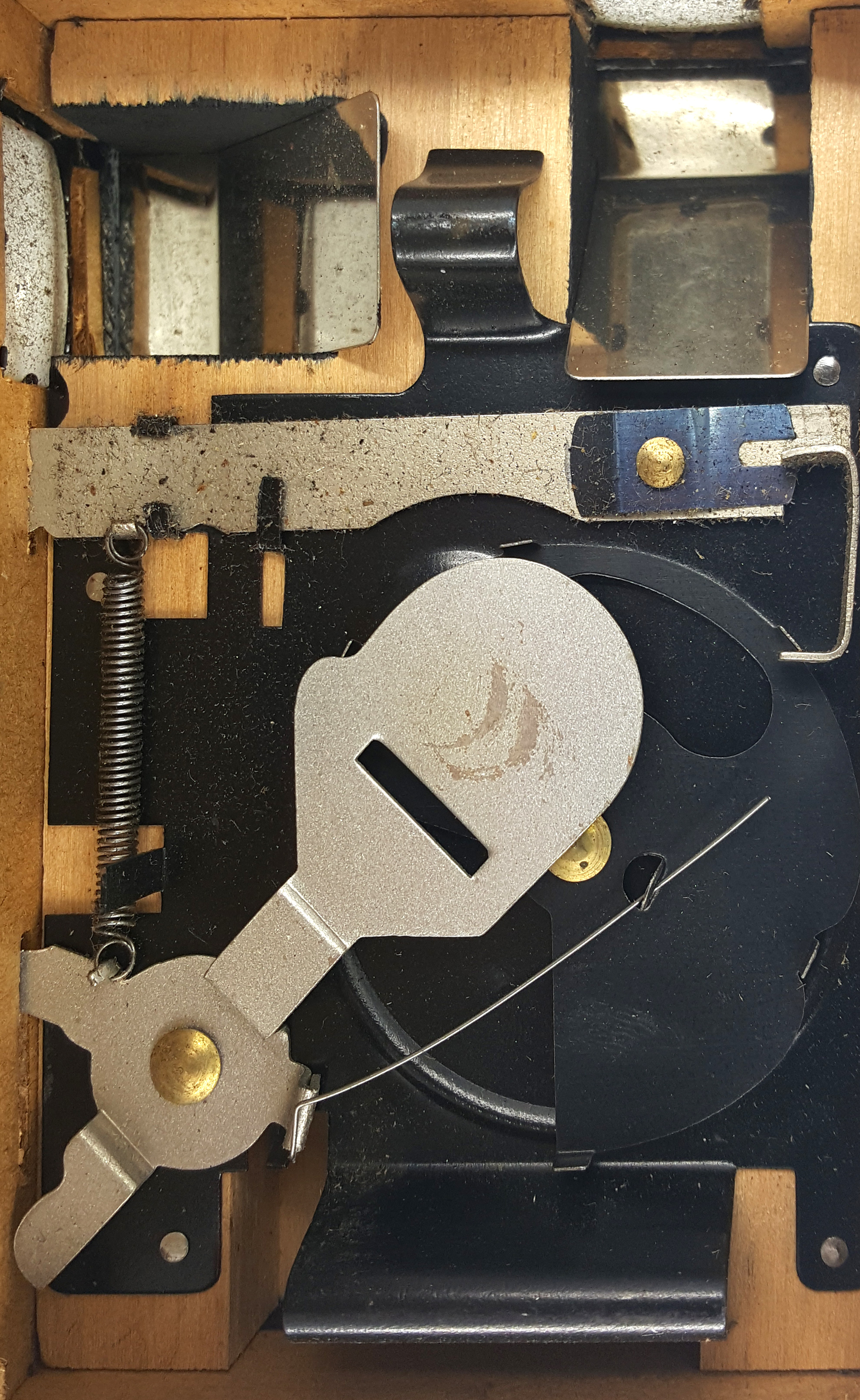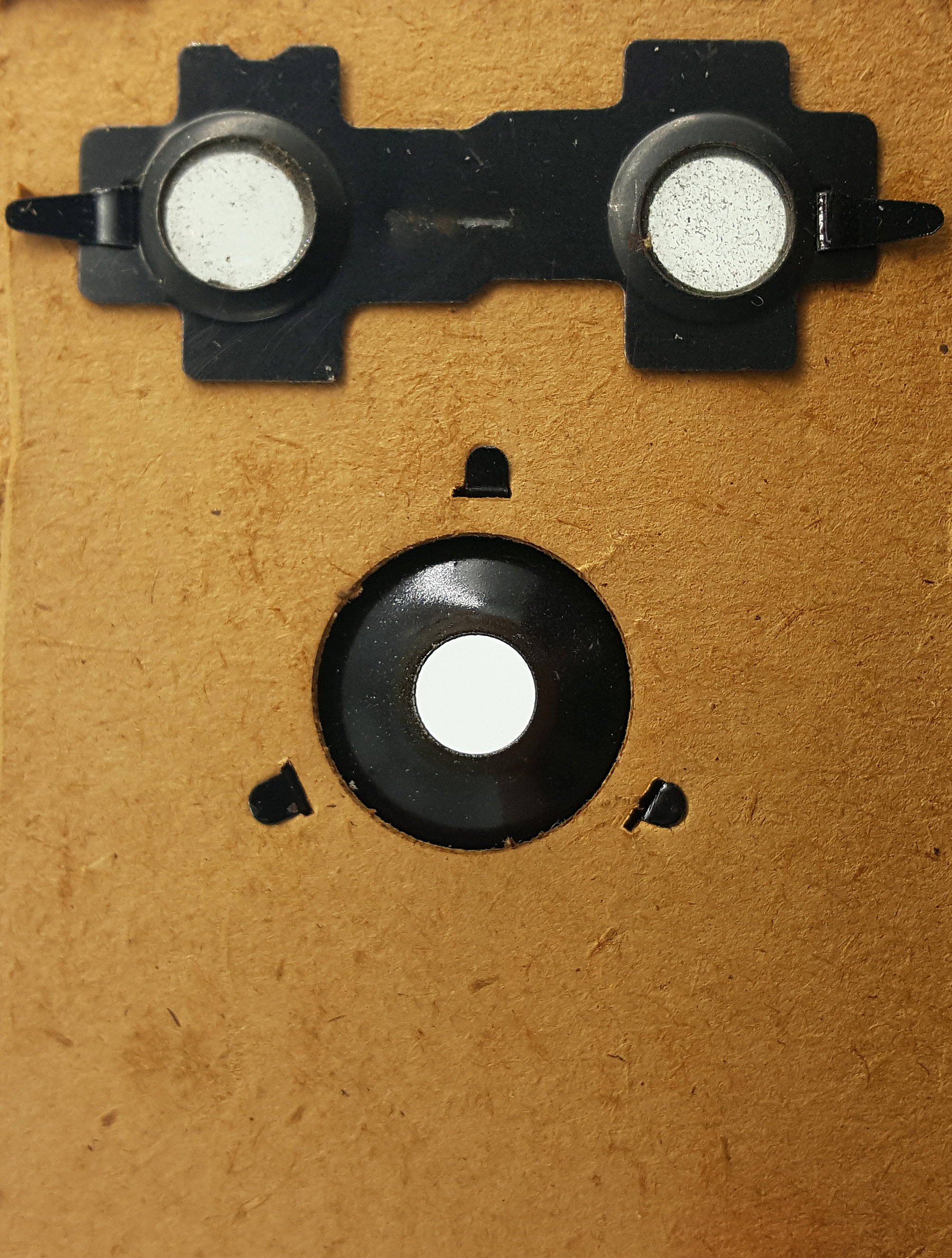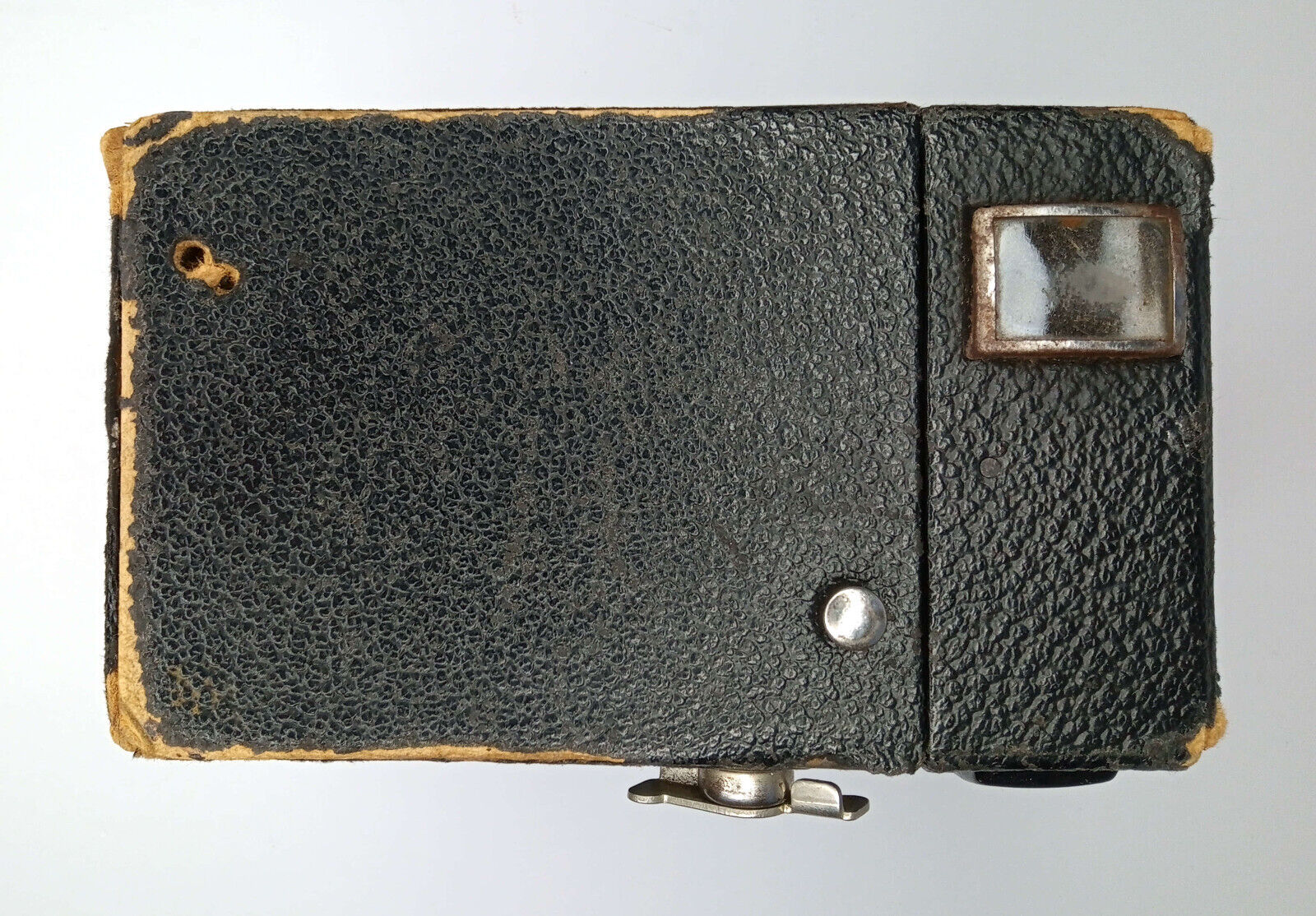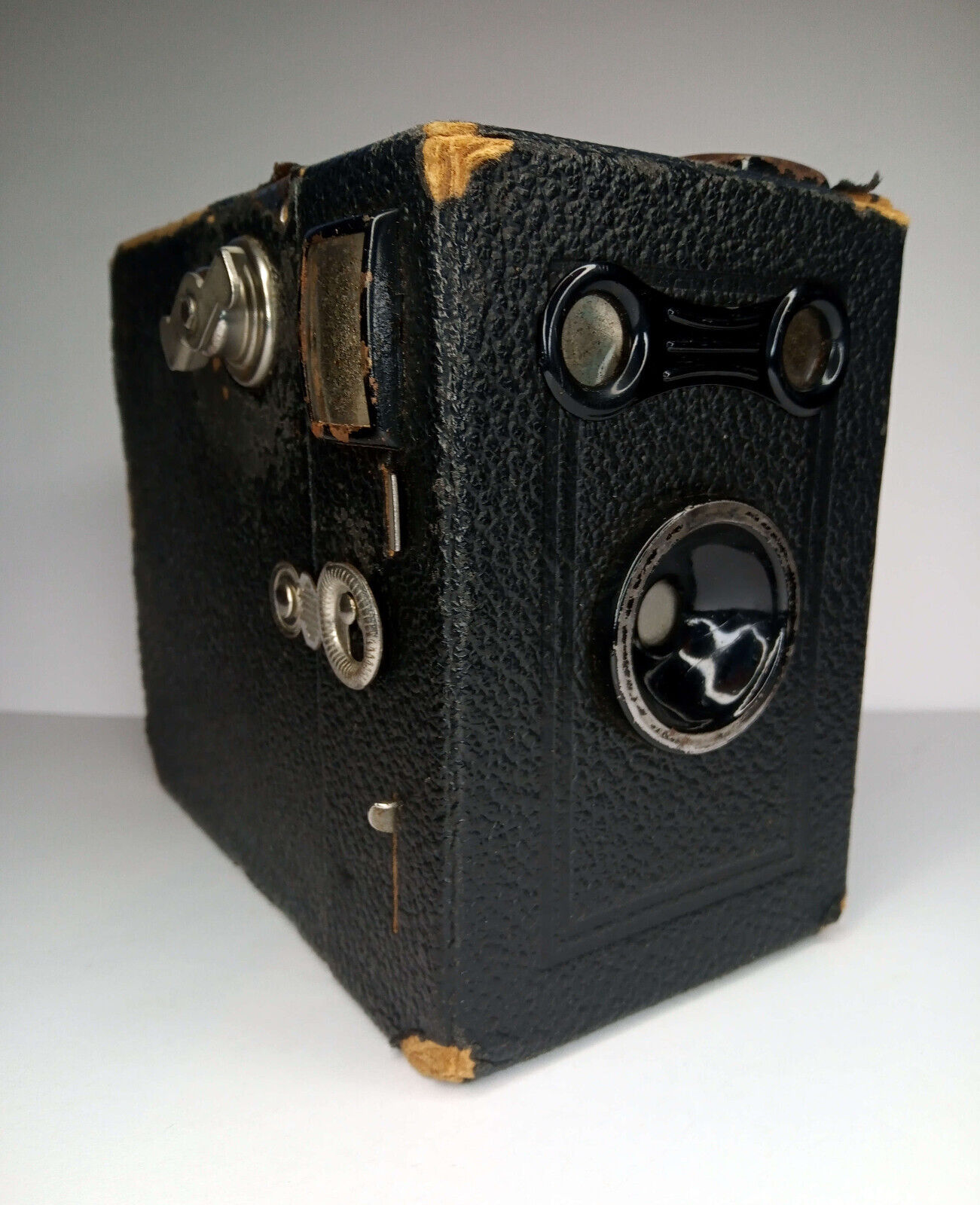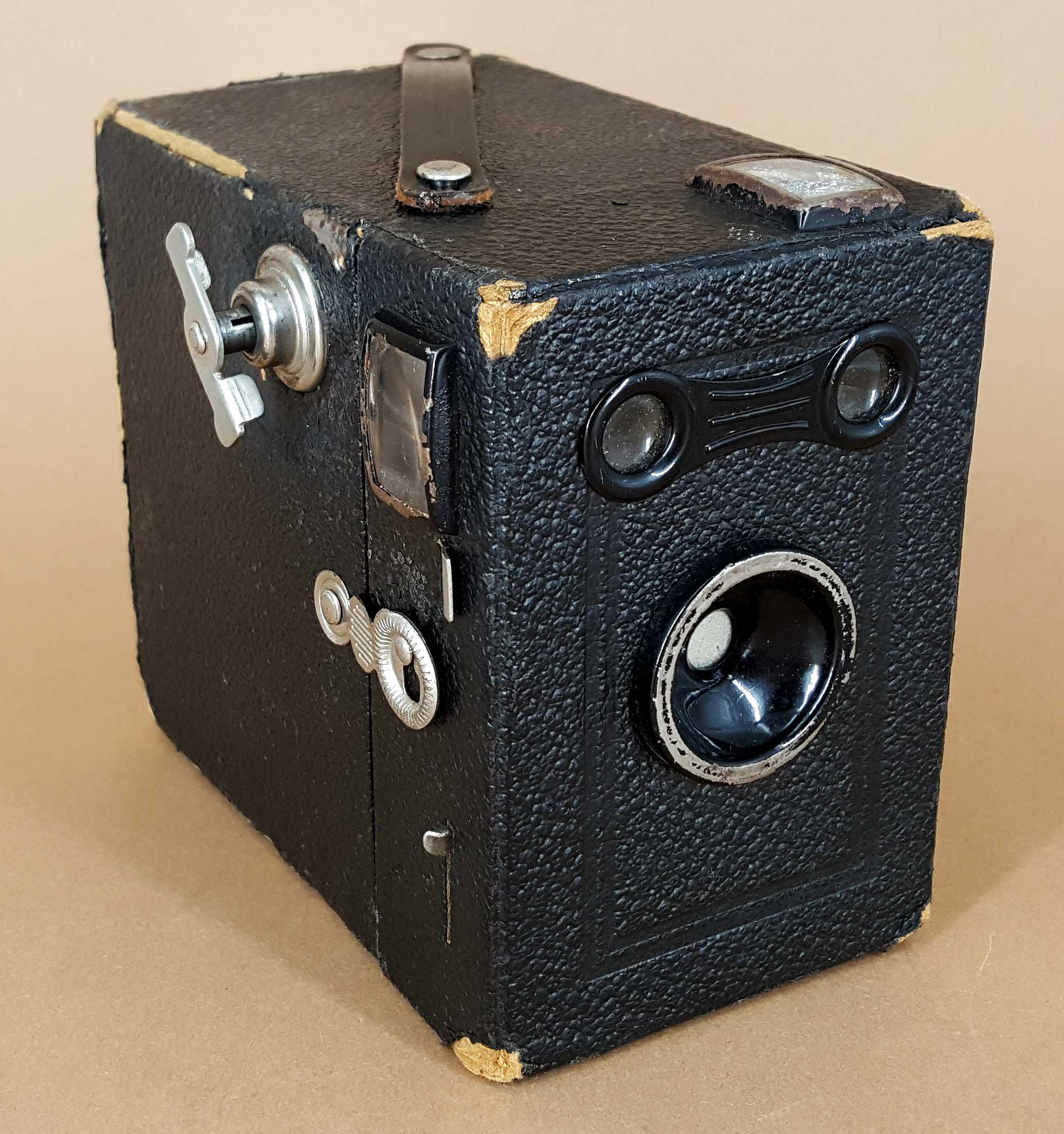 Das abgeschabte Leder erlaubt aber auch einen Blick auf sonst verborgene Details: Im Bereich des Filmtransportknopfes ist das Pappgehäuse mit Blech verstärkt. Insgesamt ist die Kamera wirklich „preiswert“ verarbeitet: Es gibt ein hölzernes Basiselement in dem Verschluss, Objektiv, Sucher, Auslöser und der Filmträger befestigt sind. Dieser vordere Kamerateil ist mit einem belederten Pappgehäuse verkleidet, wobei das Pappgehäuse mit sieben Nägeln am Holzelement festgenagelt wurde. Der Filmträger ist mit zwei großen Nägeln im Inneren des Trägers mit dem Holzelement verbunden. Ein Blick hinter die "Brille" gibt dann endgültig Gewissheit: Die „Brillenbox“ wurde von Balda hergestellt, denn es ist deutlich der patentierte Balda-Verschluss zu erkennen.