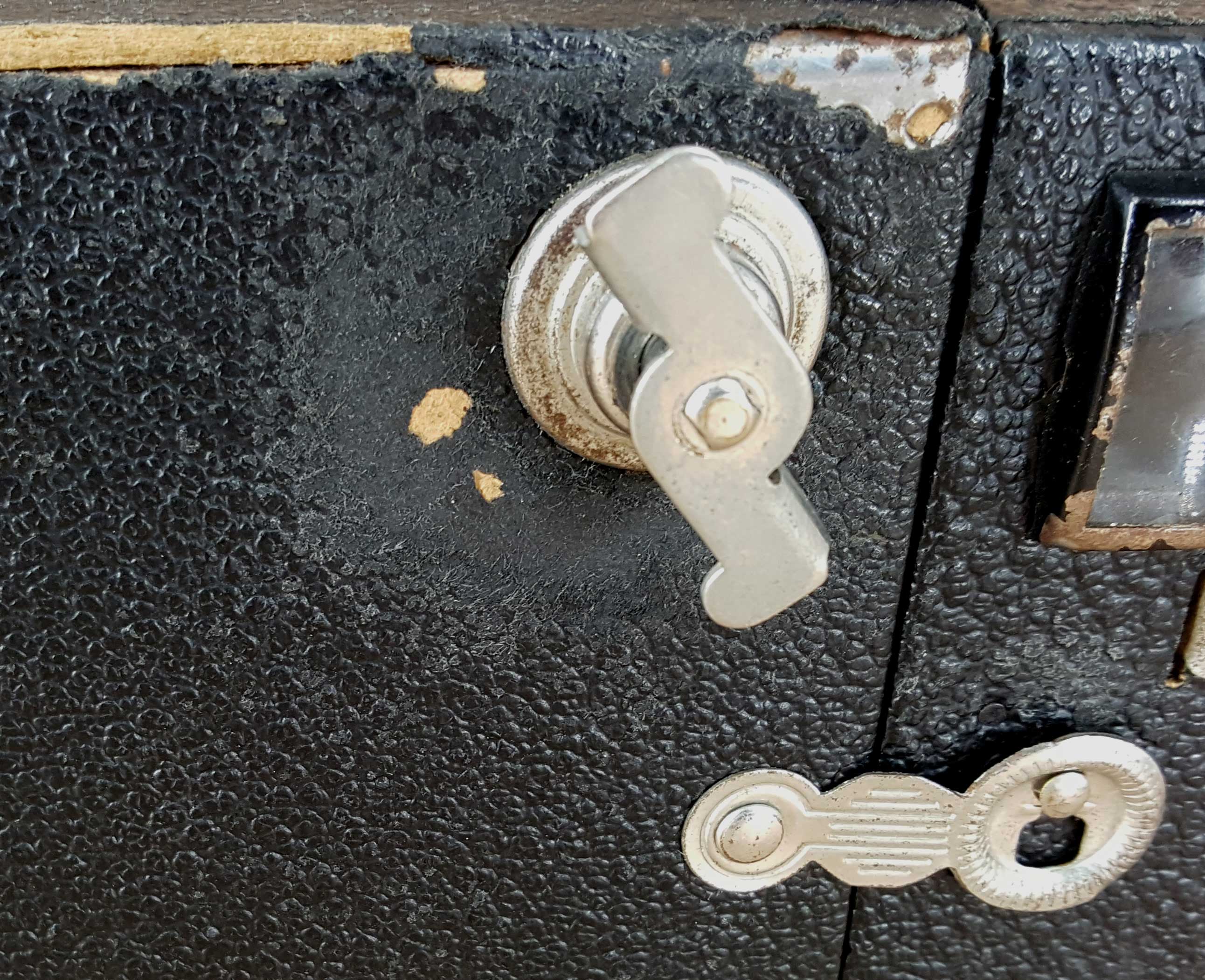Weil die Neugier doch groß war, habe ich mir für kleines Geld eine „Brillenbox“ besorgt. Man sieht der Kamera an, dass sie ausgiebig in Gebrauch gewesen ist. An allen Ecken, teilweise an den Kanten und auch um den Filmtransportknopf herum ist das Leder stark abgeschabt. Der Griff ist samt einer Befestigungsniete verlorengegangen.