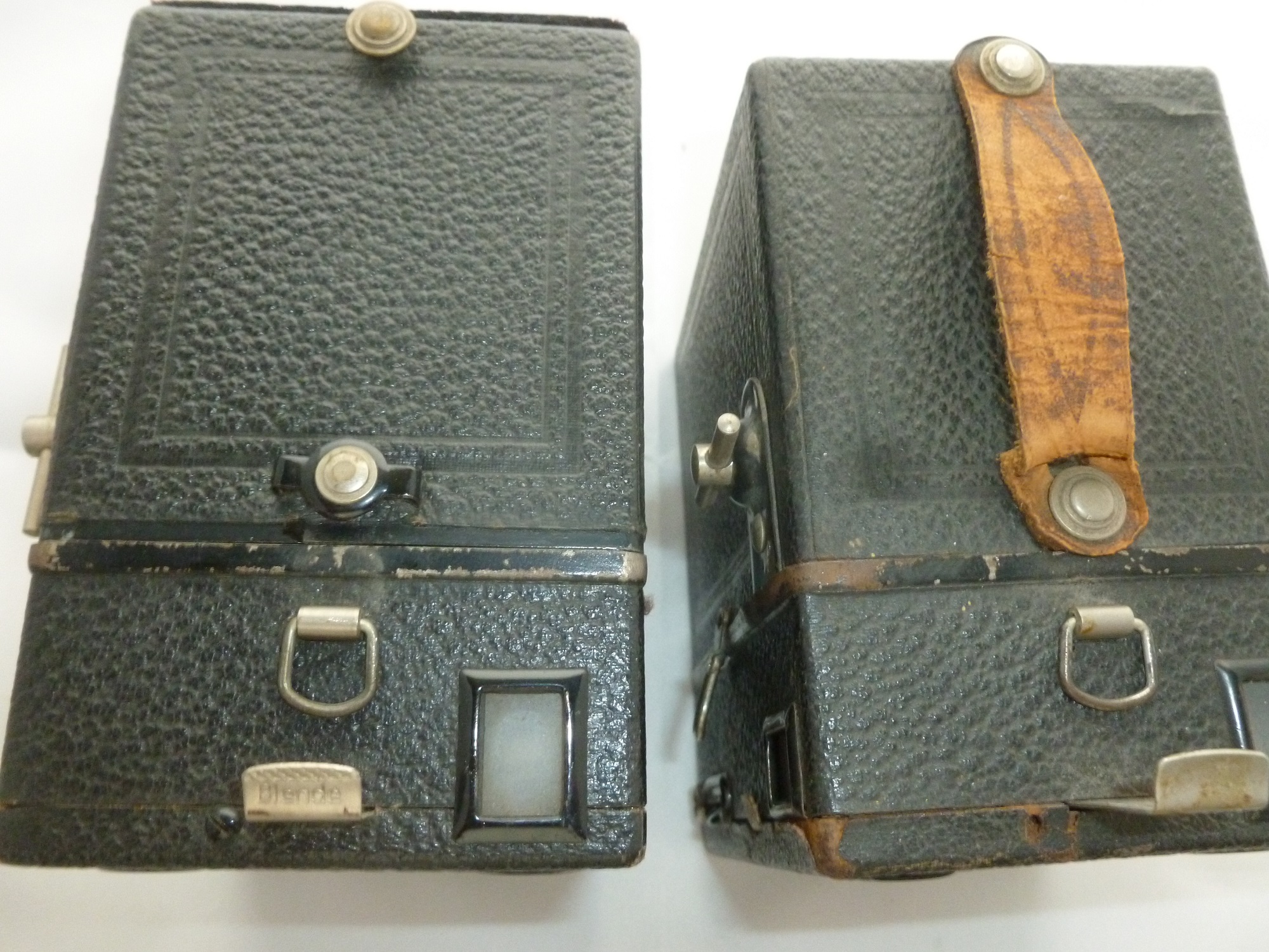 In der Liste gibt es einen Hinweis auf die vielfältigen Tengor 54-2 aus Zeit um 1930 Es gibt da Unterschiede die fast nicht auffallen Hier mal 2 mit Unterschieden Linke Kamera: Griffbefestigung vorn mit eine Art von Klammer und auf dem Blendenschieber steht Blende und F: 18 F:25 Entfernungsschieber: 3 Angaben Meter. Gr 4mtr Portr 1mtr Rechte Kamera: andere Griffbefestigung Blendenschieber ohne jede Beschriftung Entfernungsschieber nur G und P Sonst sind keine Unterschiede ersichtlich