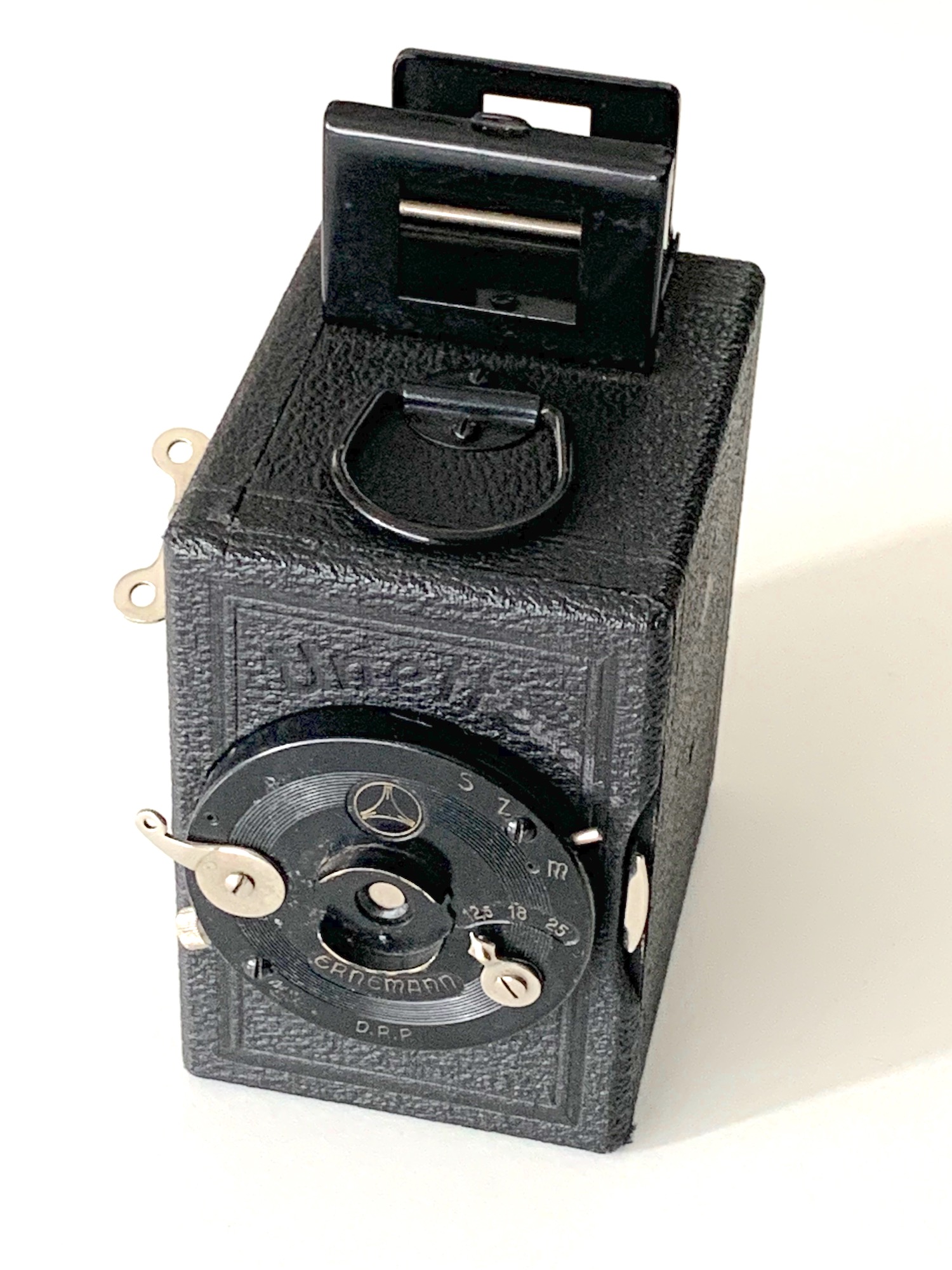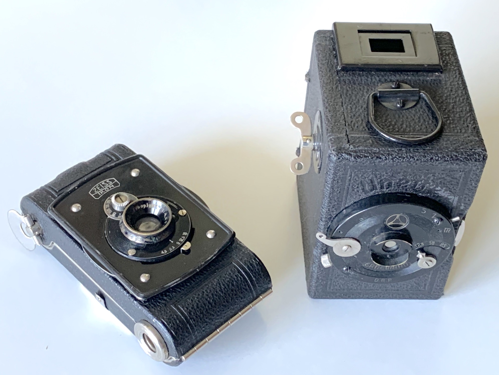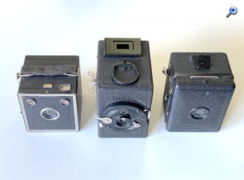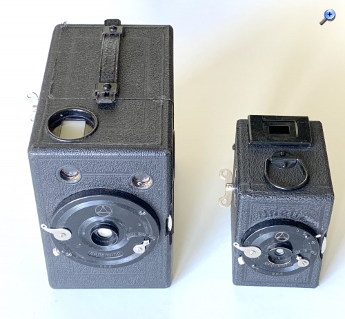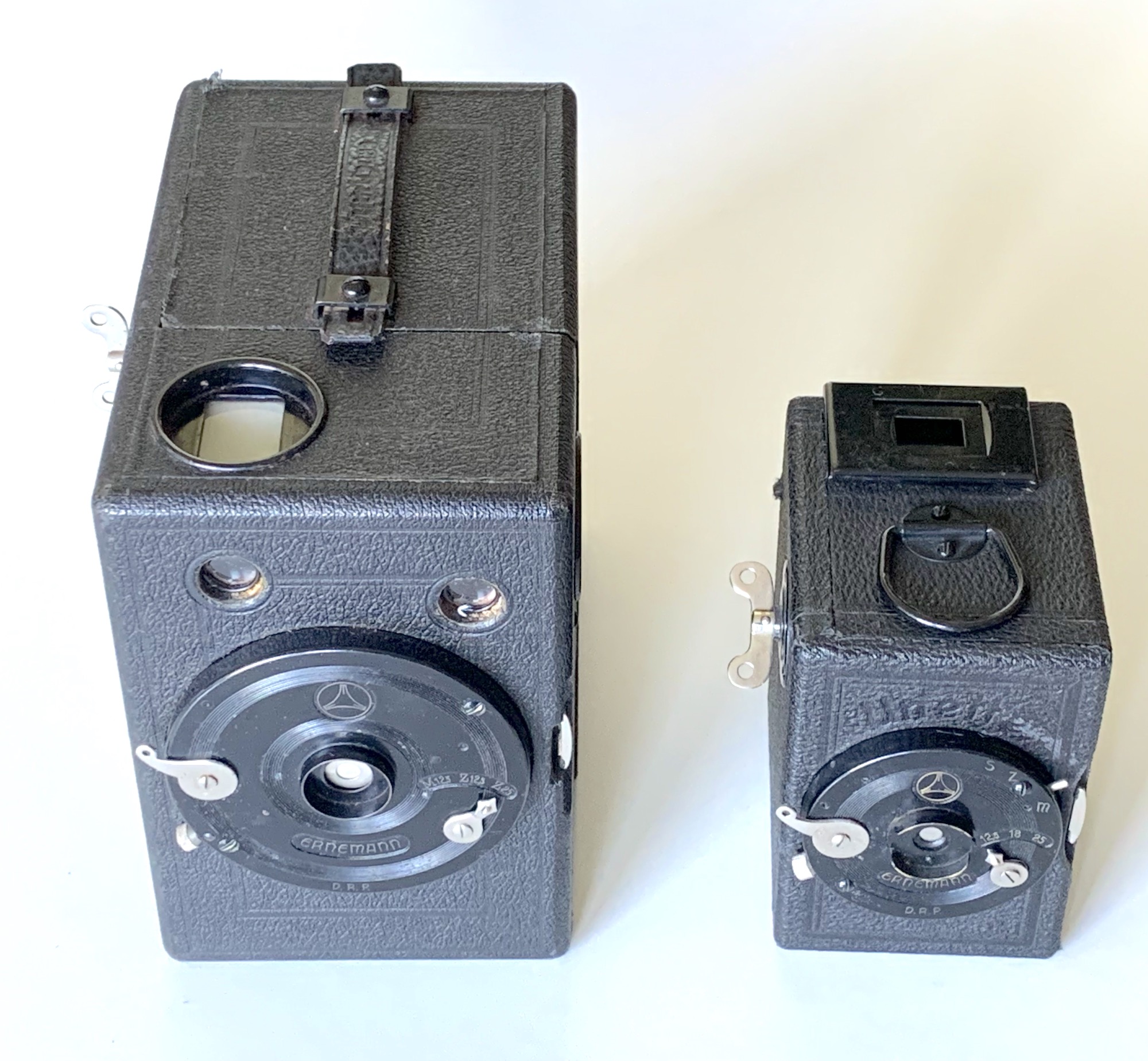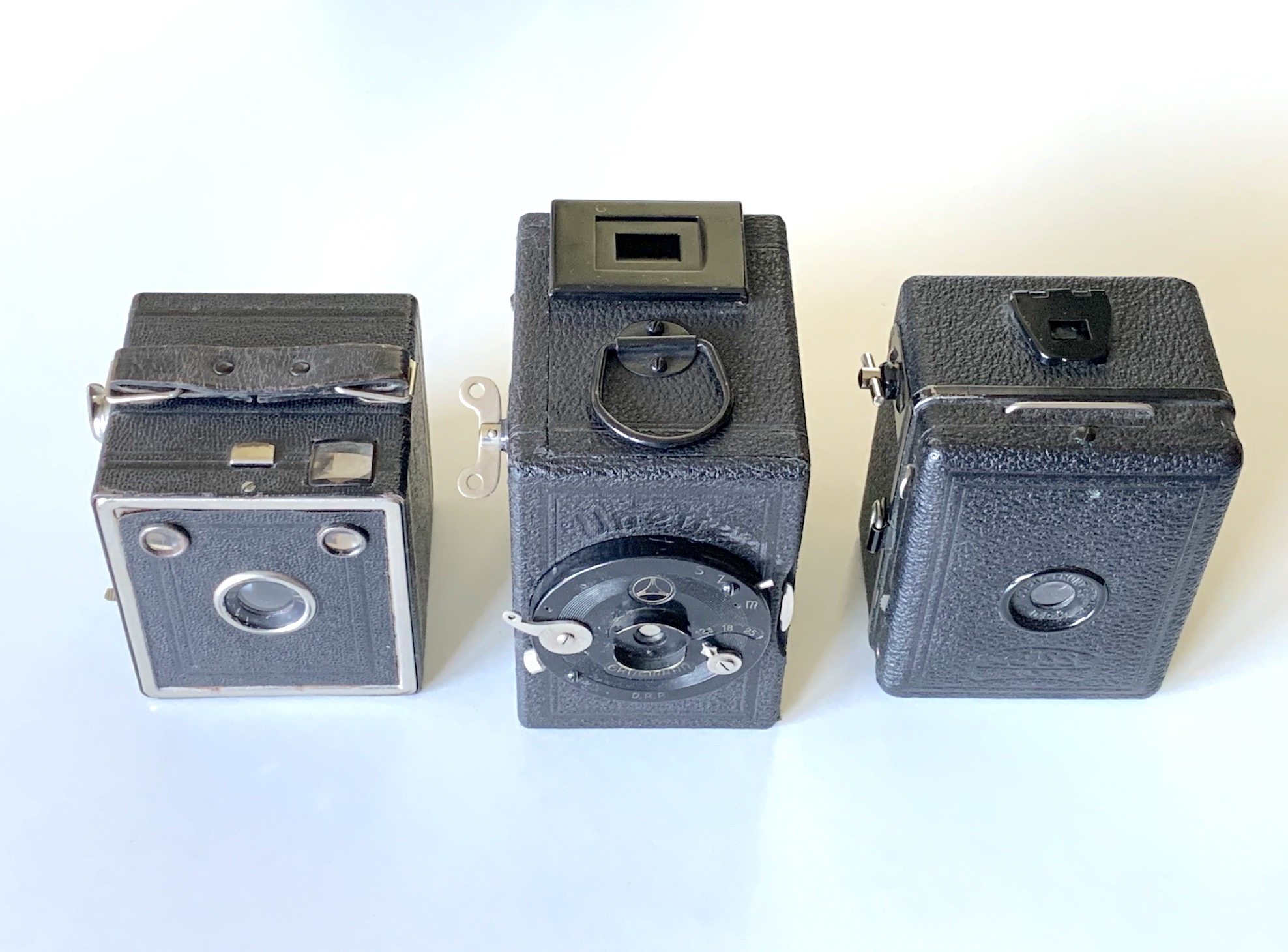 Die Kamera wirkt recht winzig, das relativiert sich aber, wenn man sie mit den später erschienenen Boxen im Format 3x4 vergleicht: Hier die Unette im Vergleich mit Zeiss Ikon Box-Tengor 54/18 (rechts) und der Eho 182 (links):