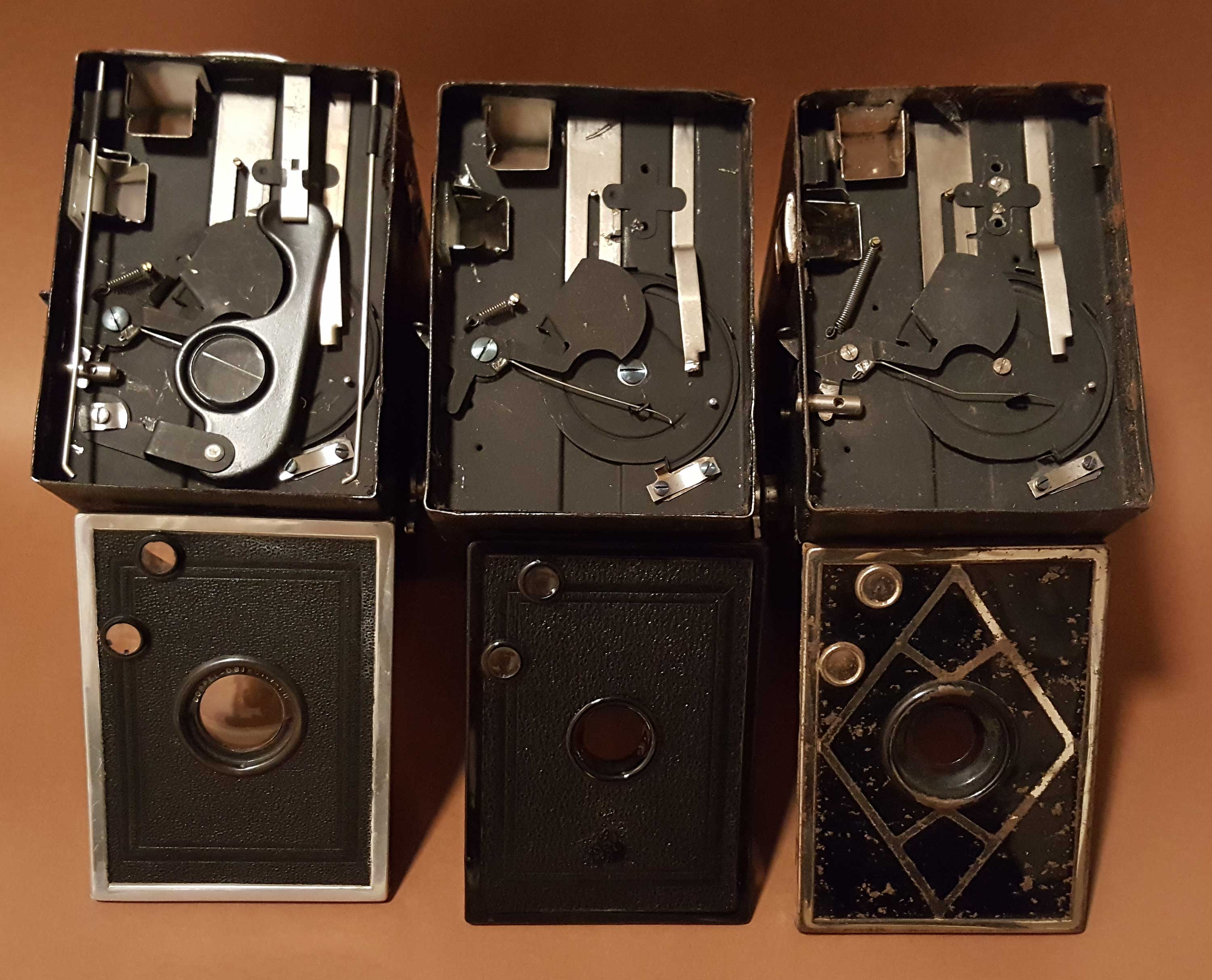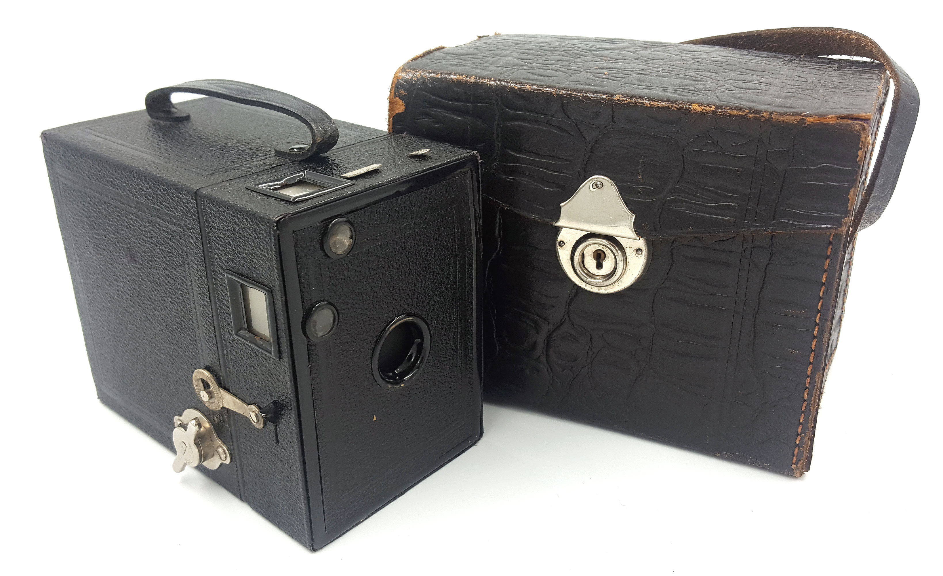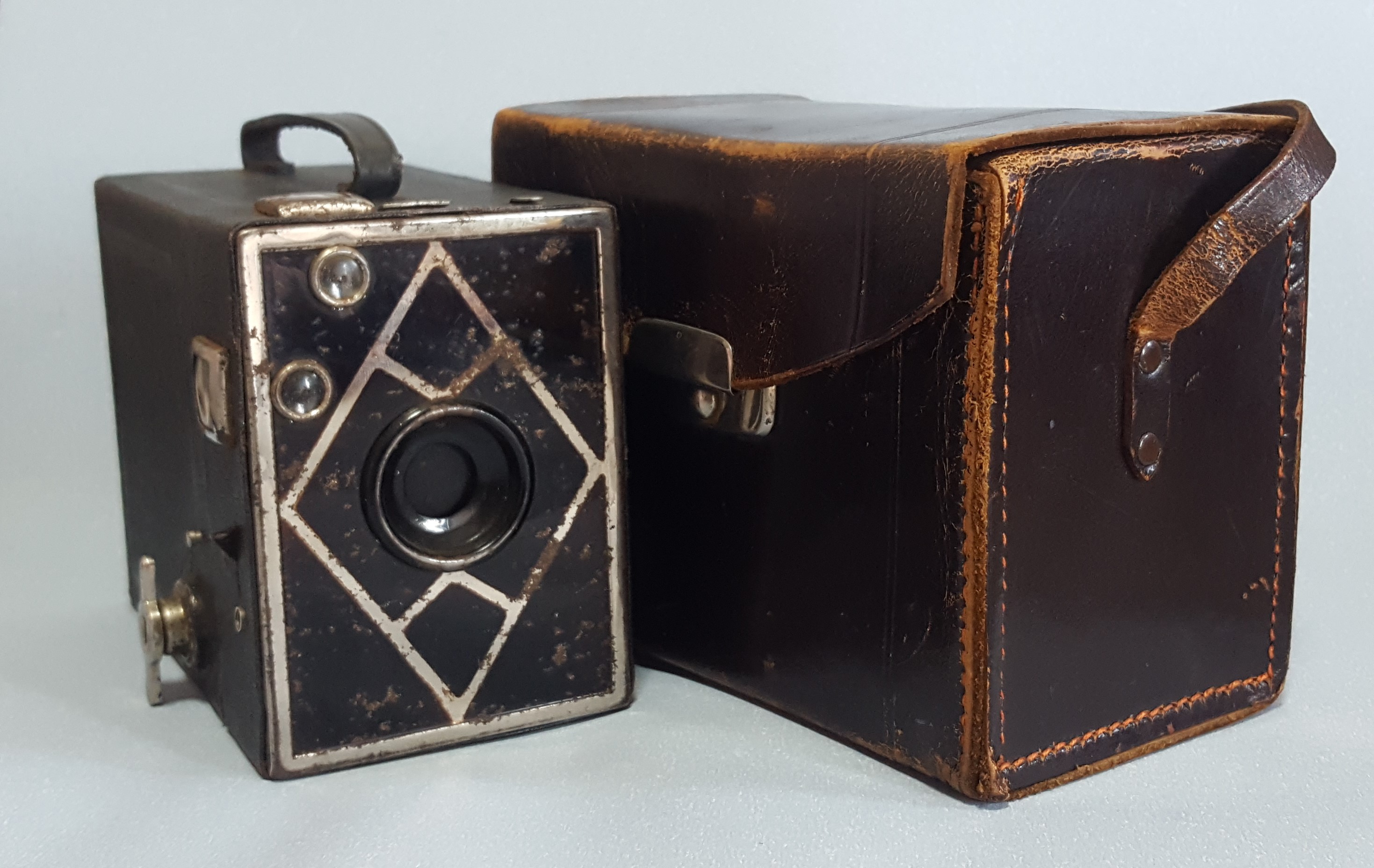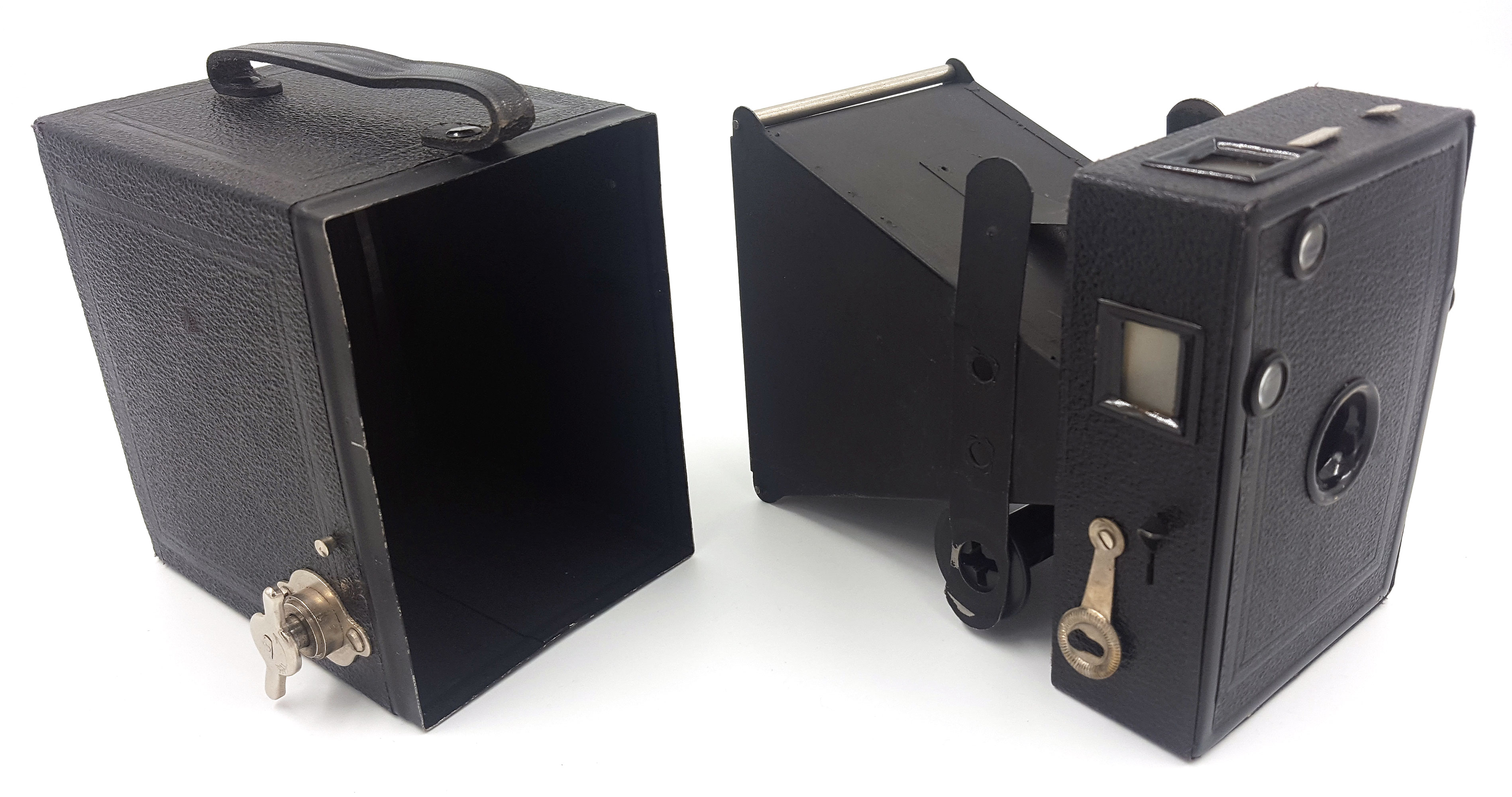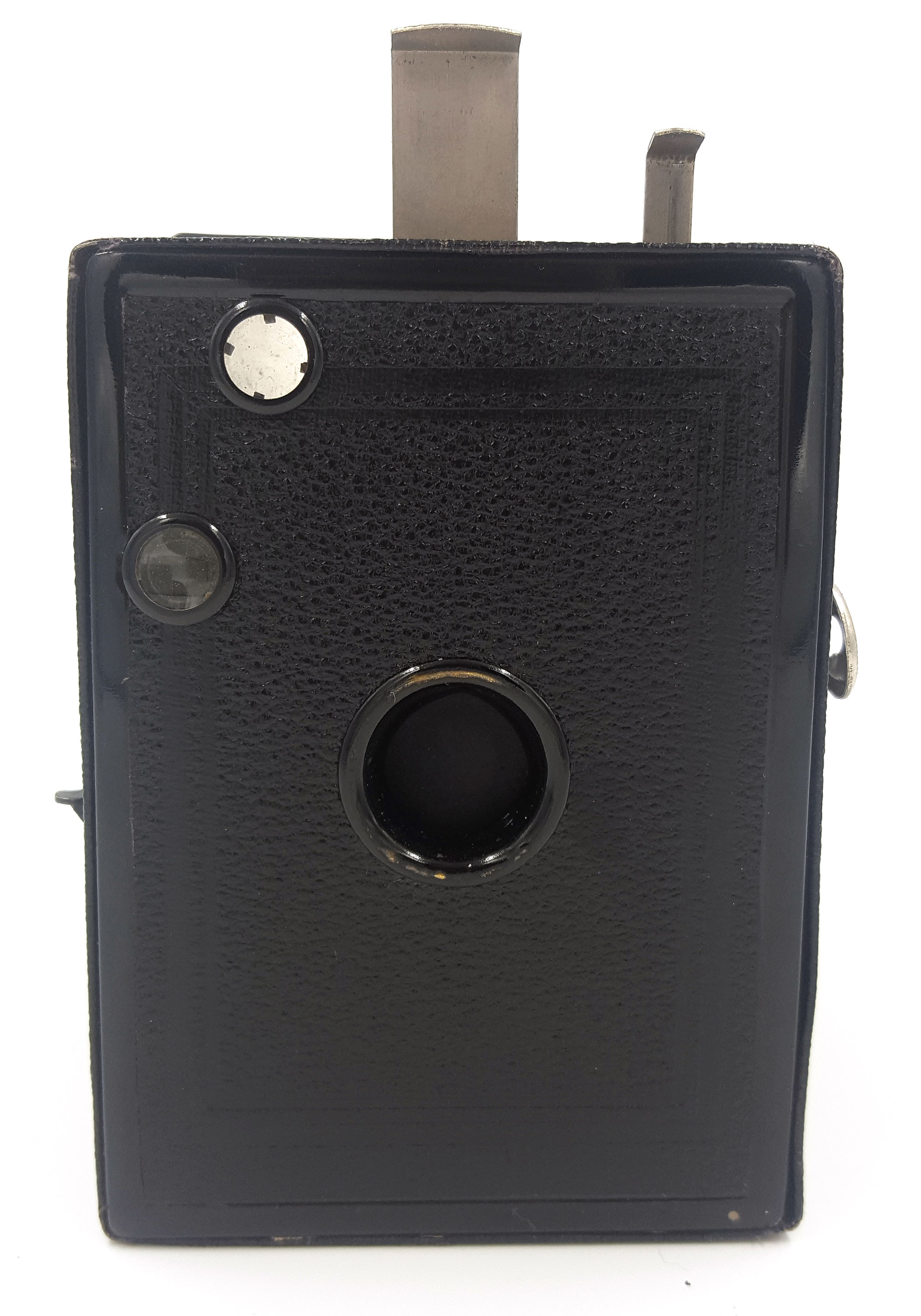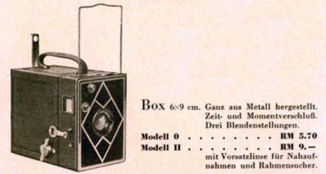 2) Box 1 = 1929 / 1930. Front mit Zierrahmen (ab 1931). Sucherrahmen. Periskop-Objektiv ("Doppelobjektiv"). Mattscheiben-Sucher.