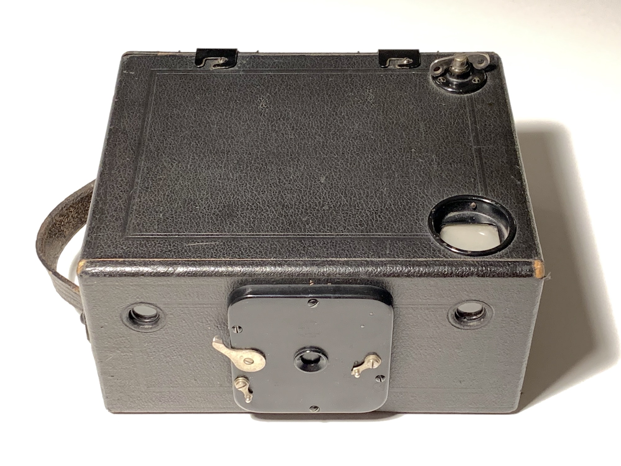 Es handelt sich um eine Boxkamera mit Holzgehäuse und angelenkter Rückwand. Die Besonderheit: Diese Box in horizontaler Bauweise ist für das Querformat ausgelegt. Das ist eindeutlich an der Beschriftung des Dosenverschlusses und der Lage des Auslösers abzulesen. Eine Versetzung um 90° wird durch die Lage der Schraubenlöcher verhindert.