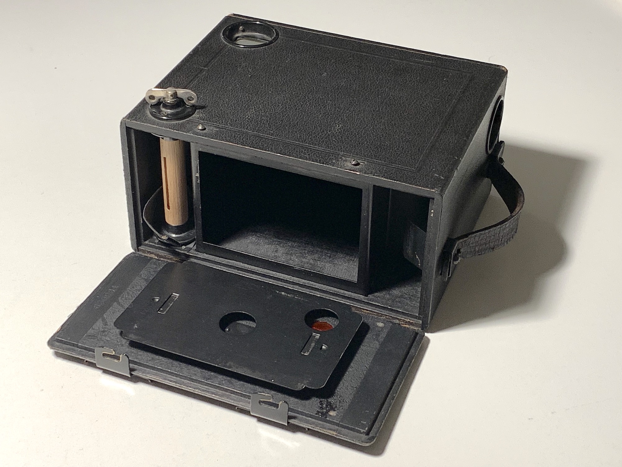 Ernemanns Beitrag zur Gattung Box-Kamera ist eine Reihe von Rollfilmkamera mit Holzgehäuse, die die Bezeichnung Film-K tragen. Woher der Name stammt, ist mir nicht recht klar: Film-Kastenkamera? Es gibt aber auch ein seltenes Modell mit der Bezeichnung Film-U…. – Die Film-K wurde in mehreren Formaten angeboten, und es gab zwei Generationen, die sich im Aufbau unterscheiden. Hier das erste Modell im Format 6x9, gebaut im Zeitraum 1916–1920.