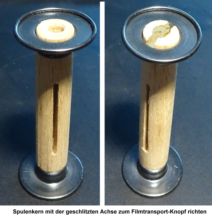 Gleich vornweg der Hinweis auf das Problem der Wickelspulenkerne. An beiden Achsenseiten befinden sich bei Holzkernspulen unterschiedliche Löcher: Ein Rundloch, ein Schlitzloch (in das der Greifer des Kamera-Aufzugknopfes einrasten kann und muss). Die Spule muss so herum eingelegt werden, dass die Schlitzlochseite zum Filmtransportknopf zeigt.