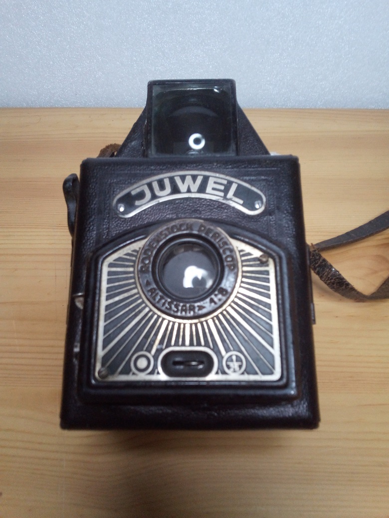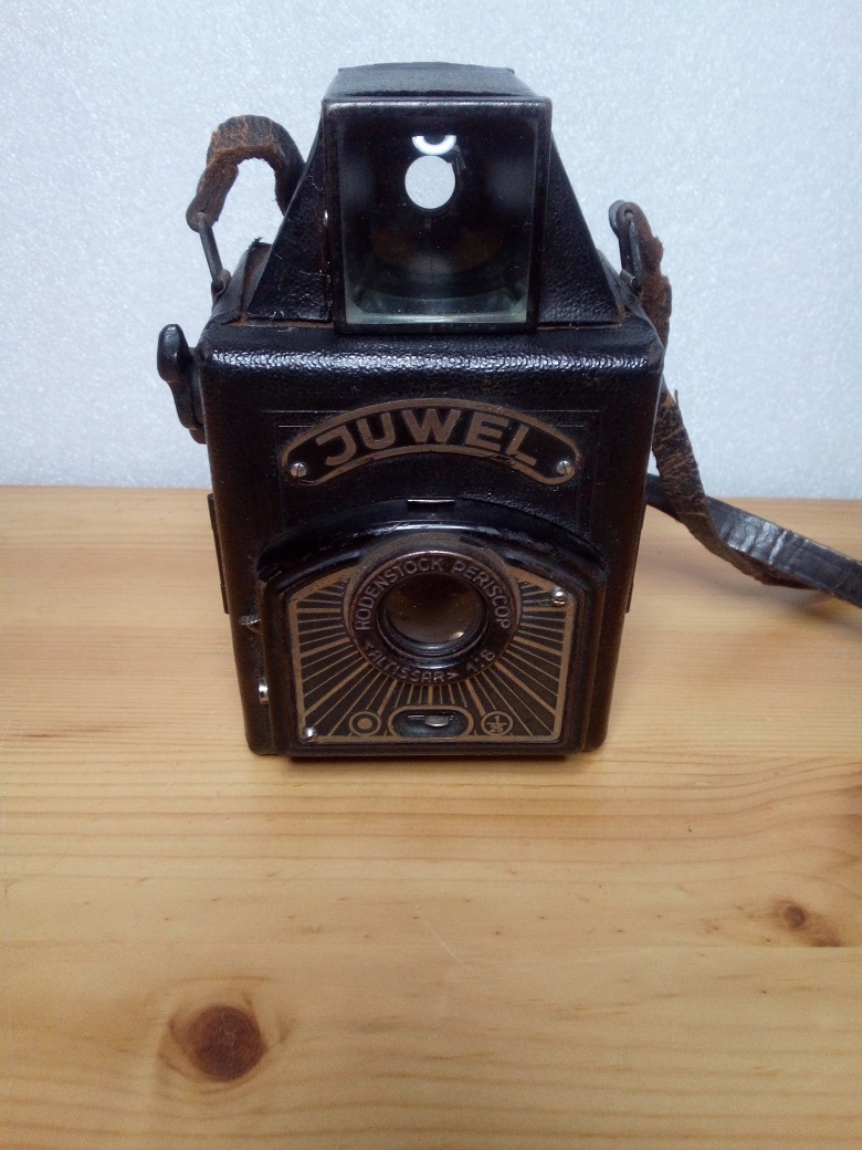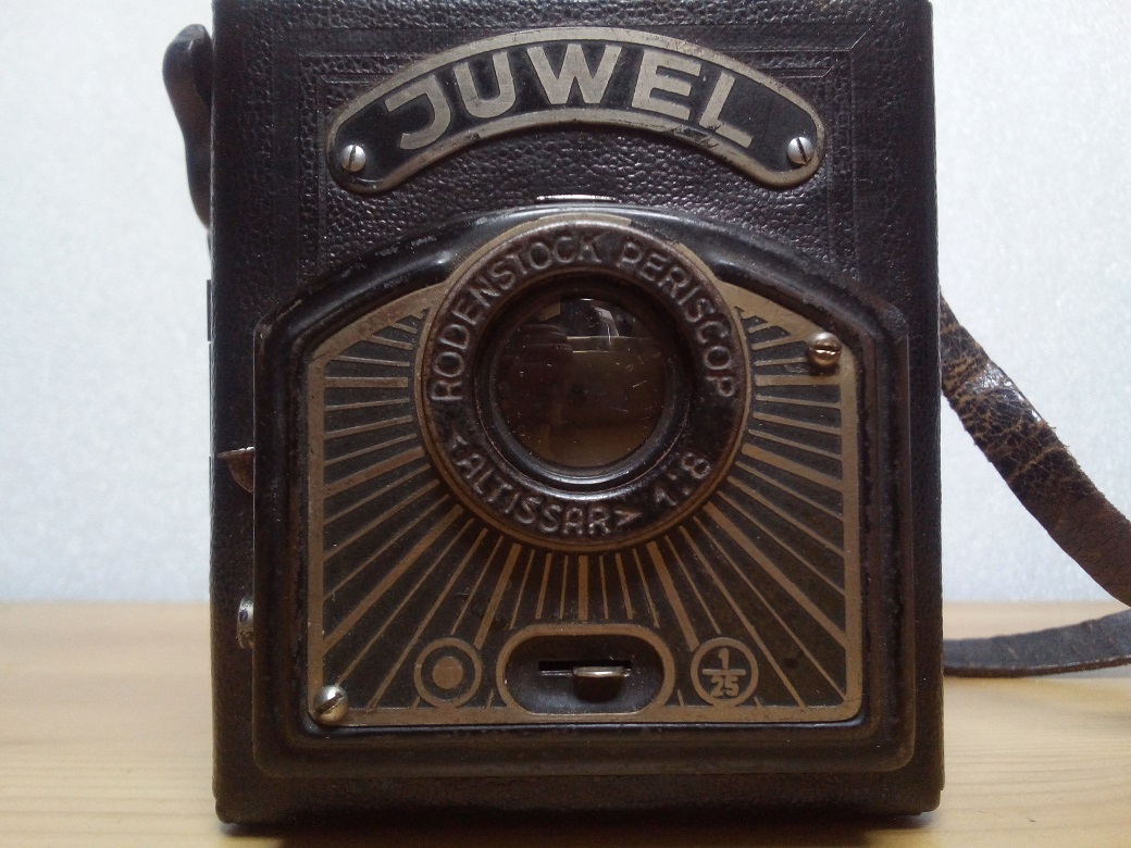 Hersteller: EHO Altissa Werke, Dresden Modell: Juwel Baujahr: ca. 1936/38 Verschluß: Rotationsverschluß, "B" und 1/25 sec Blenden: 8 und 16 über Schieber Objektiv: Rodenstock Periscop Altissar 1:8 Fokus: Fixfokus