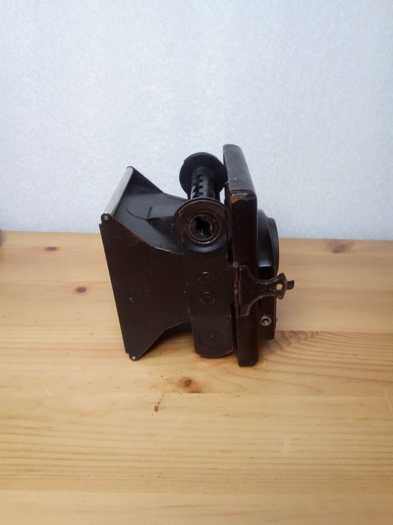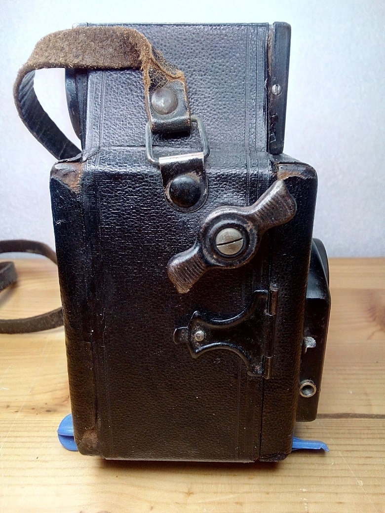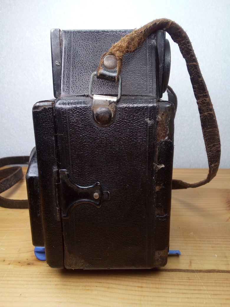 seit einigen Tagen habe ich diese, mit sehr starken Gebrauchsspuren behaftete, Eho Altissa Juwel Kamera im Bestand. Die Internetrecherche ergab, dass es sich, da noch ein Rodenstock Periscop Objektiv verbaut ist, um ein Vorkriegsmodell aus den Jahren 1936/38 handeln müßte.