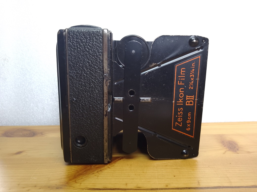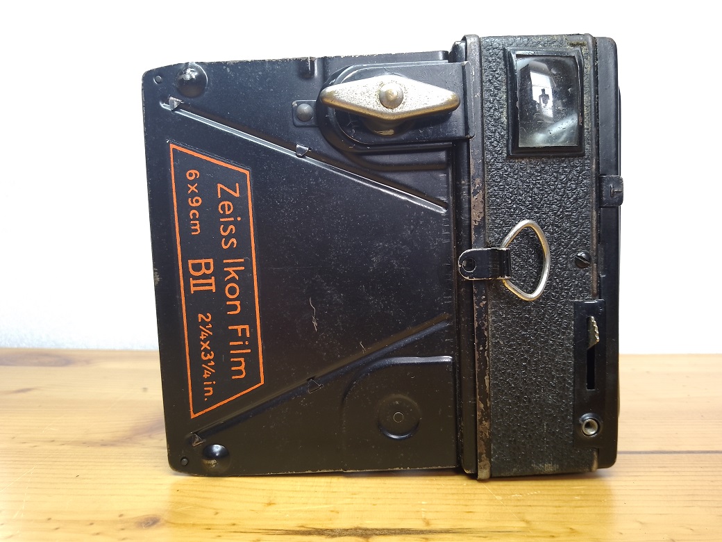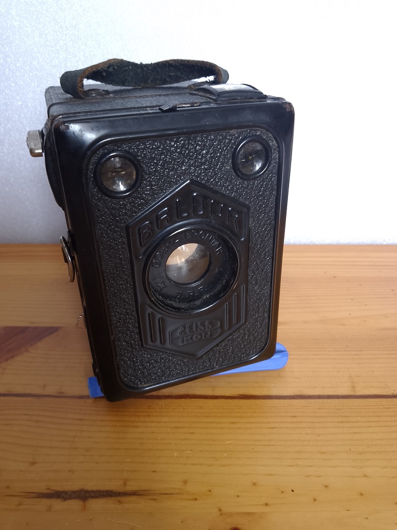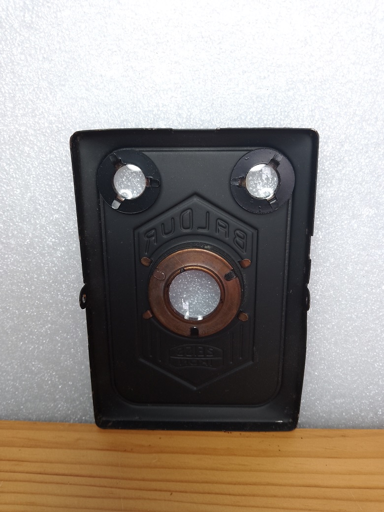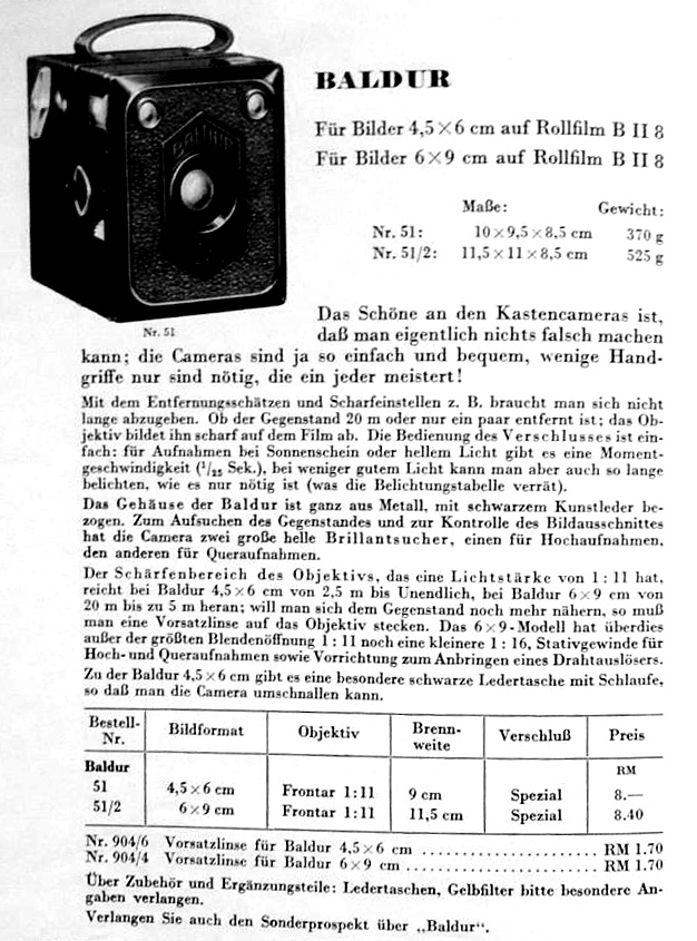 Hersteller: ZEISS IKON Modell: Baldur Box 51/2 6x9 Typ: Box Kamera für Rollfilm 120, 8 Aufnahmen im Format 6x9 Baujahr: 1934 - 1936 Verschluß: Rotationsverschluß, "B" und 1/25 sec Blenden: 11 und 16 Objektiv: Goerz Frontar Achromat 1:11 / 115 Fokus: Fixfokus 5 Meter - unendlich Neupreis (1934): 8,40 RM