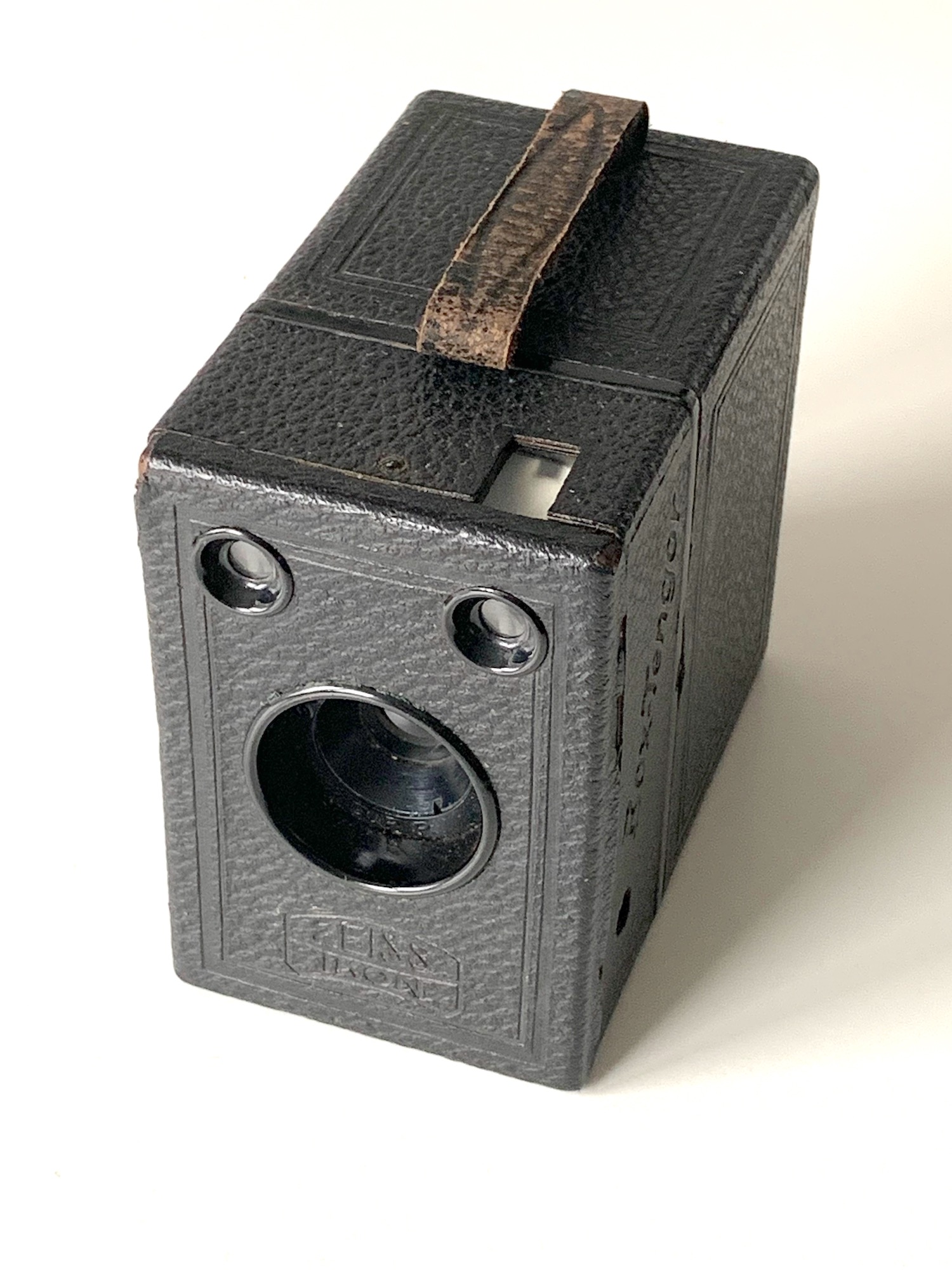 Zur Nummerngebung: Die neuen Bestellnummern, bei der die Ziffer hinter dem Schrägstrich das Bildformat kennzeichnet, gab es erst ab April 1929. Vorher wurden die alten Bestellnummern der Vorgängerfirmen verwendet. Ein Beispiel: Die Ica Ideal 225 wurde zur Zeiss Ikon Ideal 225; erst nach der Nummernumstellung wurde daraus das Modell 250/7. Das gilt auch für diese Boxen. Eine 54/14 hat die entsprechende Prägung im Leder und stammt dann auch frühestens aus dem Jahr 1929. Da meine Kamera keine Prägung aufweist, klassifiziere ich sie als 902.