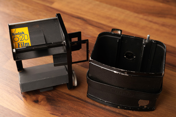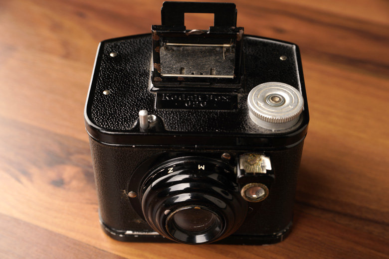 "Die nicht so übliche Kodak-Box 620 Modell c für Aufnahmen mit 6x9 cm auf 620 Film, Metallbox mit Klapprahmensucher, Kodak Spezial Shutter Meniskuslinse. Hergestellt von Kodak A.G. Stuttgart Germany 1939."