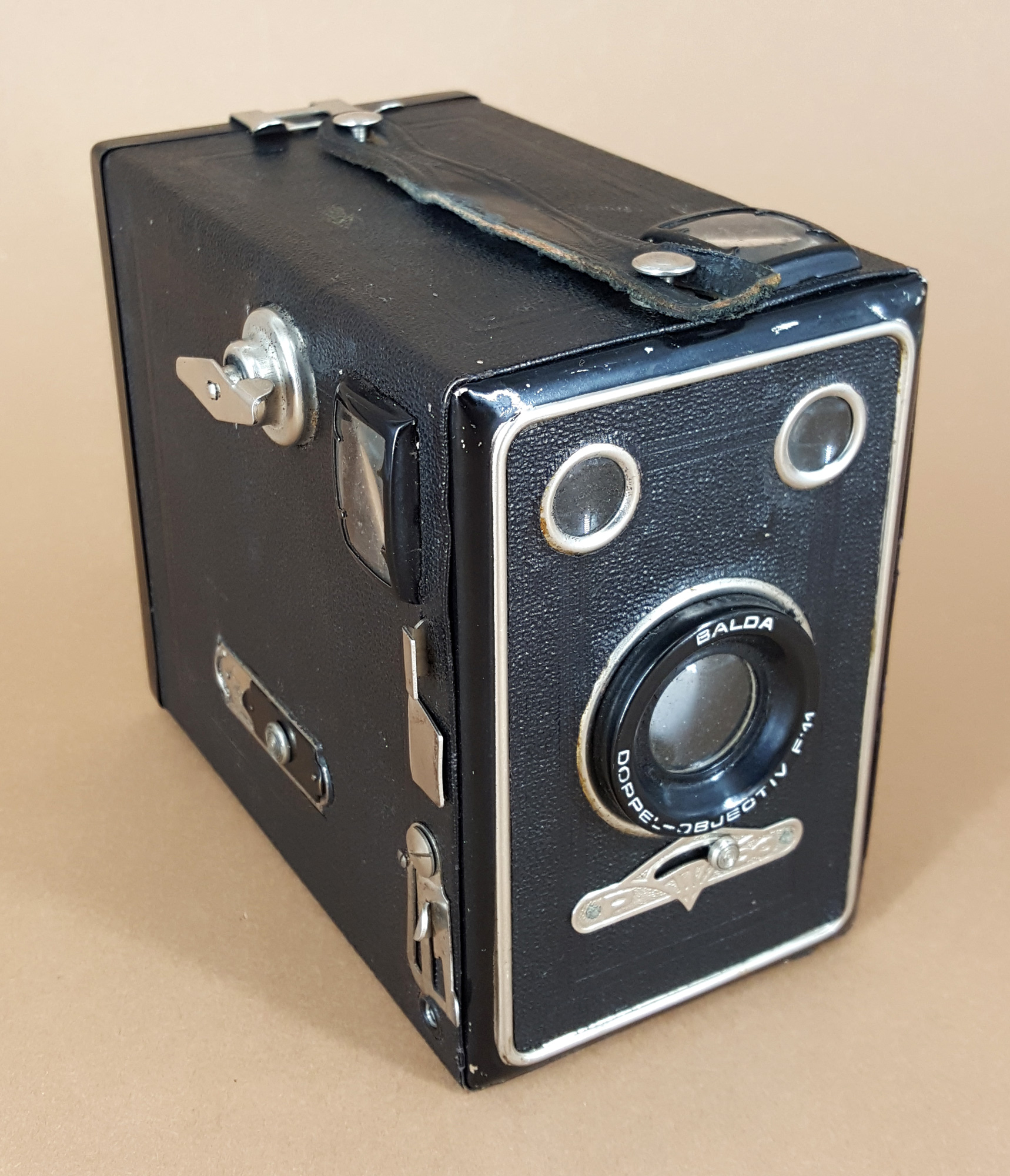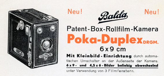 die Rollfilm-Boxkamera „Poka-Duplex“ wurde von Balda etwa ab 1934 angeboten.