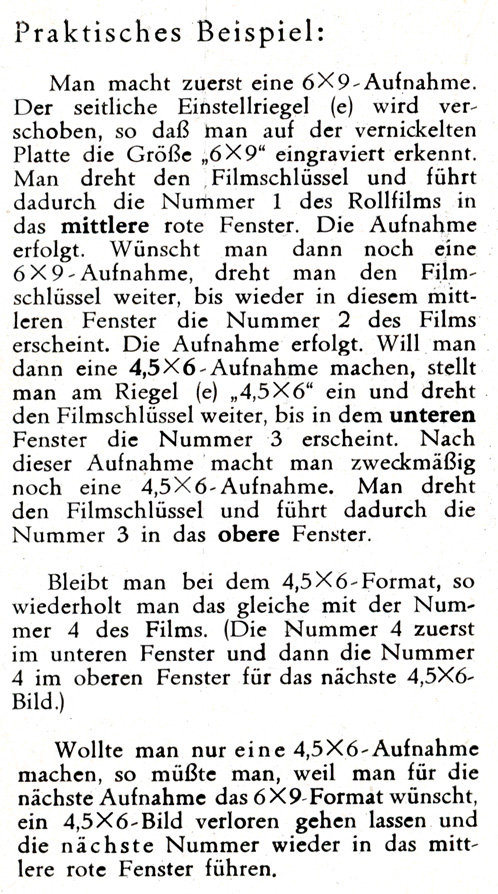 Für den korrekten Filmtransport bei den zwei unterschiedlichen Formaten besitzt die Kamera drei Filmsichtfenster. Das Prinzip Bildnummernanzeige ist im folgenden Auszug aus der Bedienungsanleitung beschrieben: