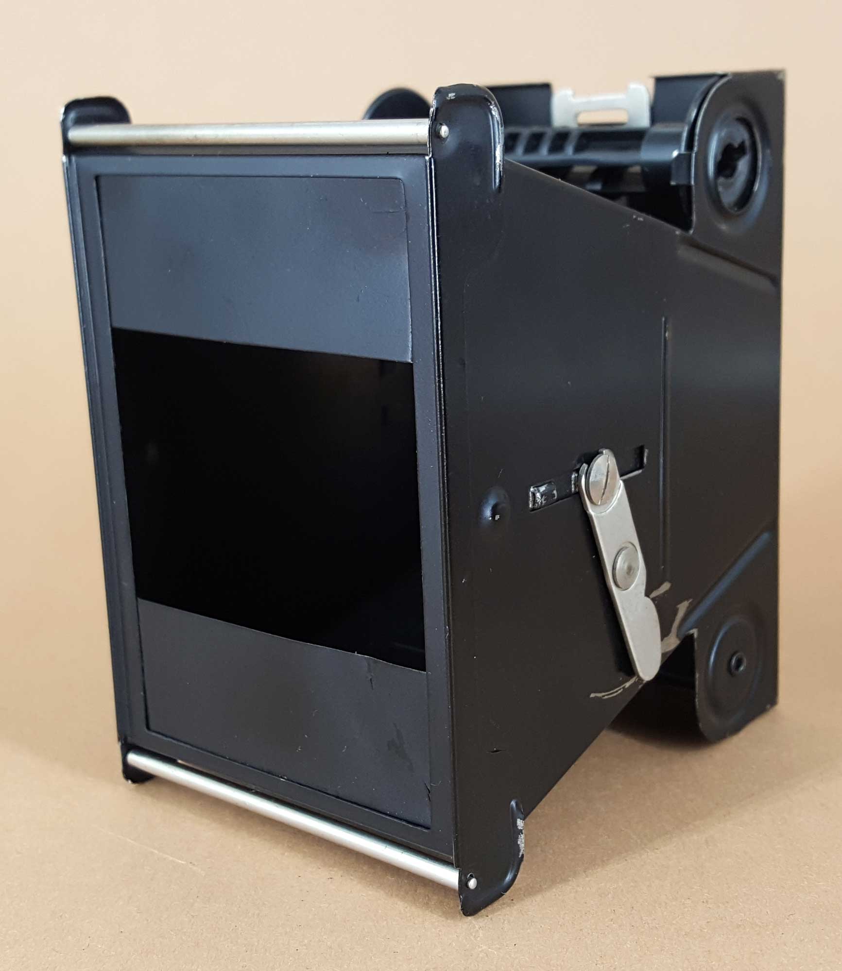 Der Formatschieber auf der Außenseite der Kamera betätigt einen Hebel an der Außenseite des Filmeinsatzes im Inneren der Kamera, welcher wiederum die zweiteilige Formatmaske im Strahlengang ein- bzw. ausschwenkt.