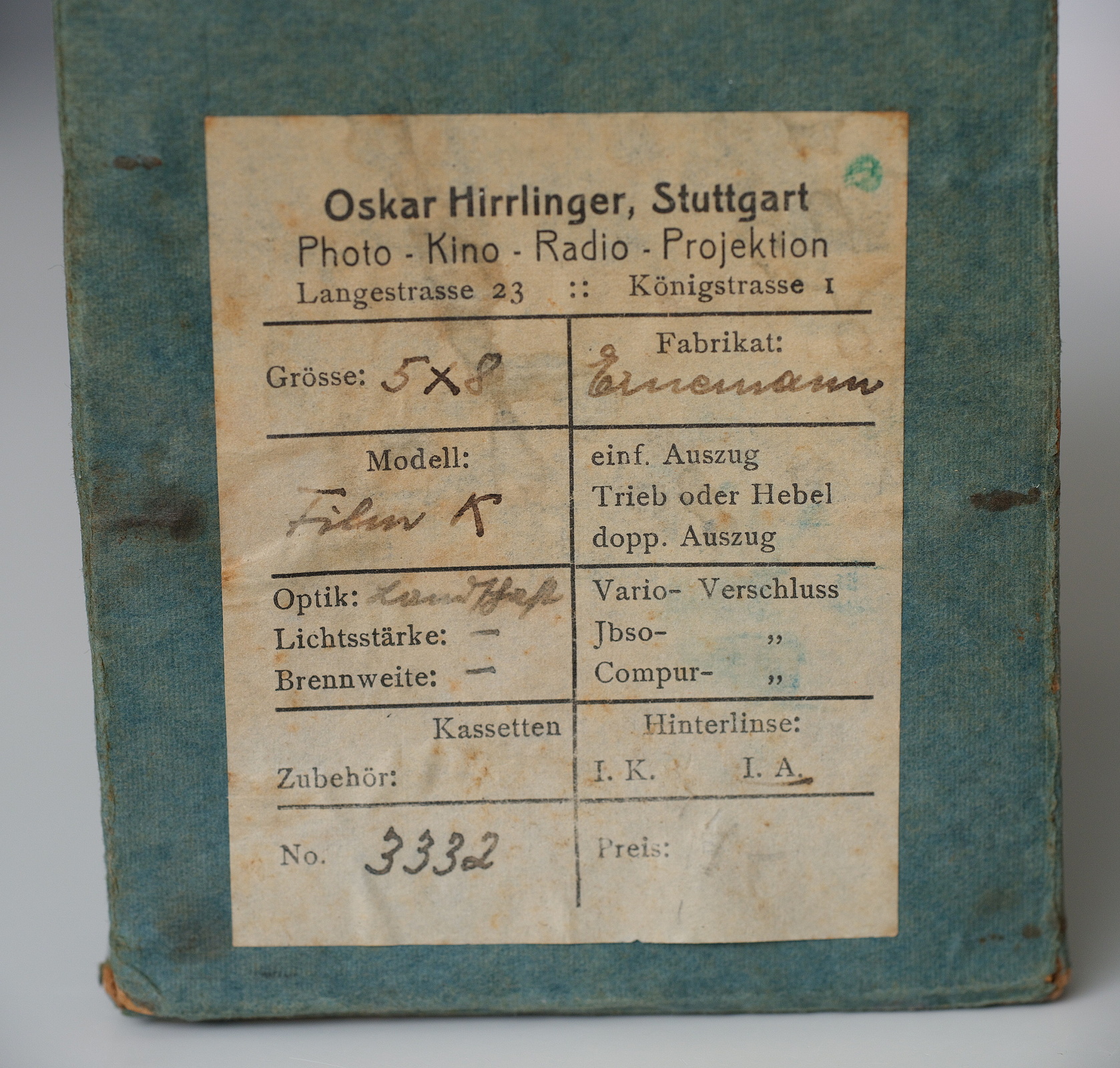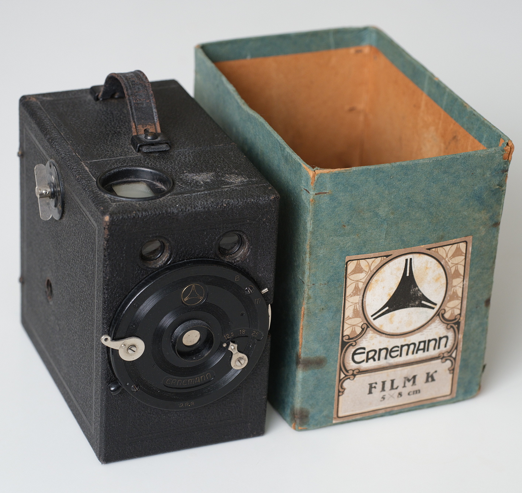 Die Kamera hat keine Seriennummer wie andere späte Film K. Es gibt wirklich keine Zeiss Ikon-Markierung auf der Kamera. Allerdings gibt es viele Kameras, die nach der Gründung der Zeiss Ikon fertiggestellt wurden und immer noch nicht die Zeiss Ikon-Kennzeichnung tragen. Beispielsweise weist ein seltenes Bi-Tengor aus einer ähnlichen Zeit (April 1927) ebenfalls keine Zeiss-Ikon-Markierung auf. Wenn wir bei Ernemann-Kameras bleiben, gibt es eine Bob-V-Serie im 6x6- und 4x6,5-Format mit Novar-Objektiven aus der Zeit um 1928. Einige sind mit Zeiss Ikon gekennzeichnet, andere nicht. Dennoch denke ich, dass Film K 5x8 von einer separaten Ernemann-Firma hergestellt werden könnte (auch angesichts der Ernemann-Box), aber Zeiss Ikon wurde erstellt, bevor Film K auf den Markt kam.