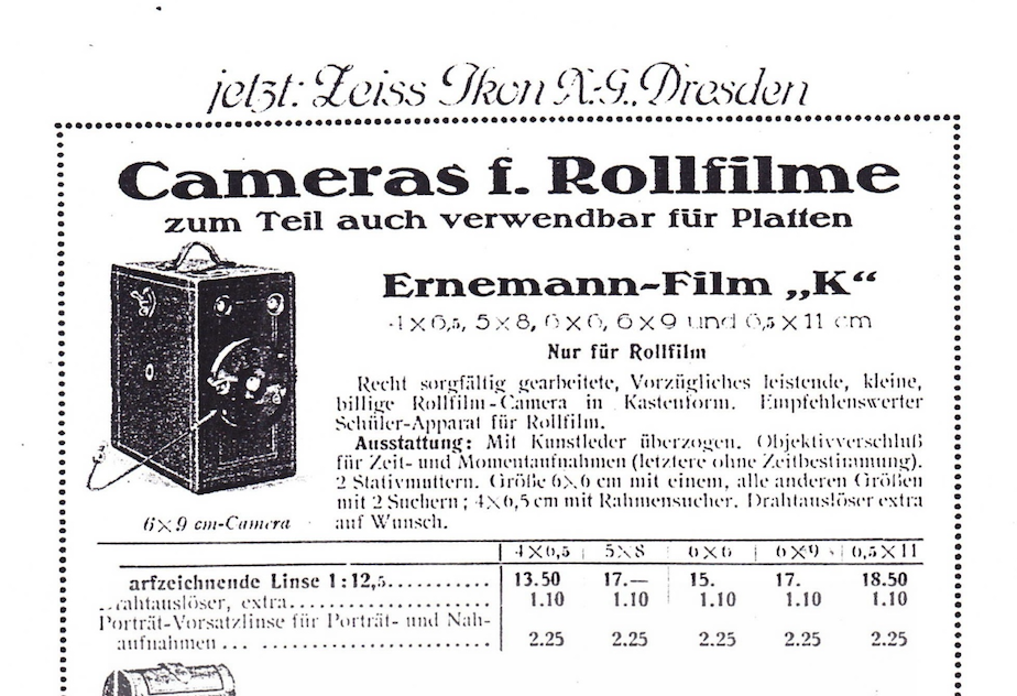Film K ist in diesem Format sehr selten. Ich habe noch kein anderes Exemplar gesehen. Dieser Typ ist in den Preislisten der Zeiss Ikon vom März und April 1927 aufgeführt. Ich habe keine Preisliste von Ernemann, die diesen Typ enthält. In den Preislisten von Ernemann sind ausschließlich weitere Formate des Typs Film K aufgeführt. Ich glaube, dieses Modell wurde erst Ende 1926 und Anfang 1927 hergestellt.