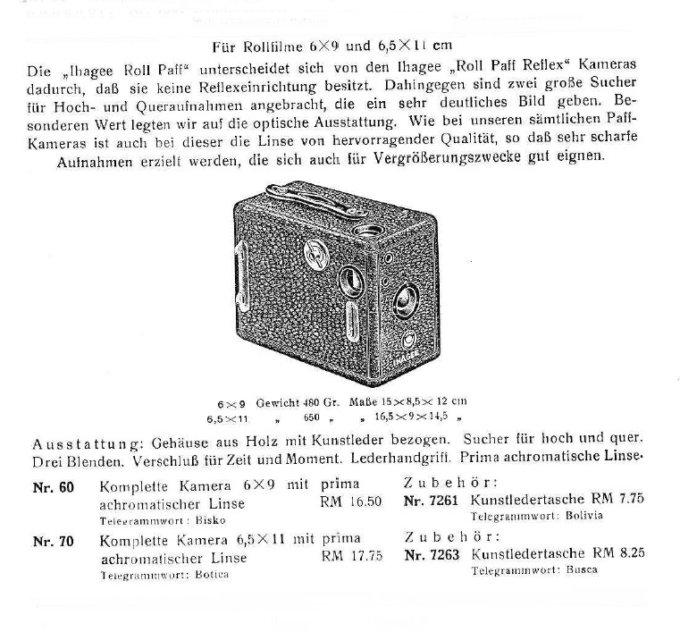 In meiner Super umfangreichen Liste sind 3 Ihagee Roll Paff Einträge ohne den Zusatz Reflex zu finden Roll Paff 50 1928 4,5x 6,5 Roll Paff 60 1928 6x9 Roll Paff 70 1928 6,5x11 jeweils mit Achromt und Spezialverschluss