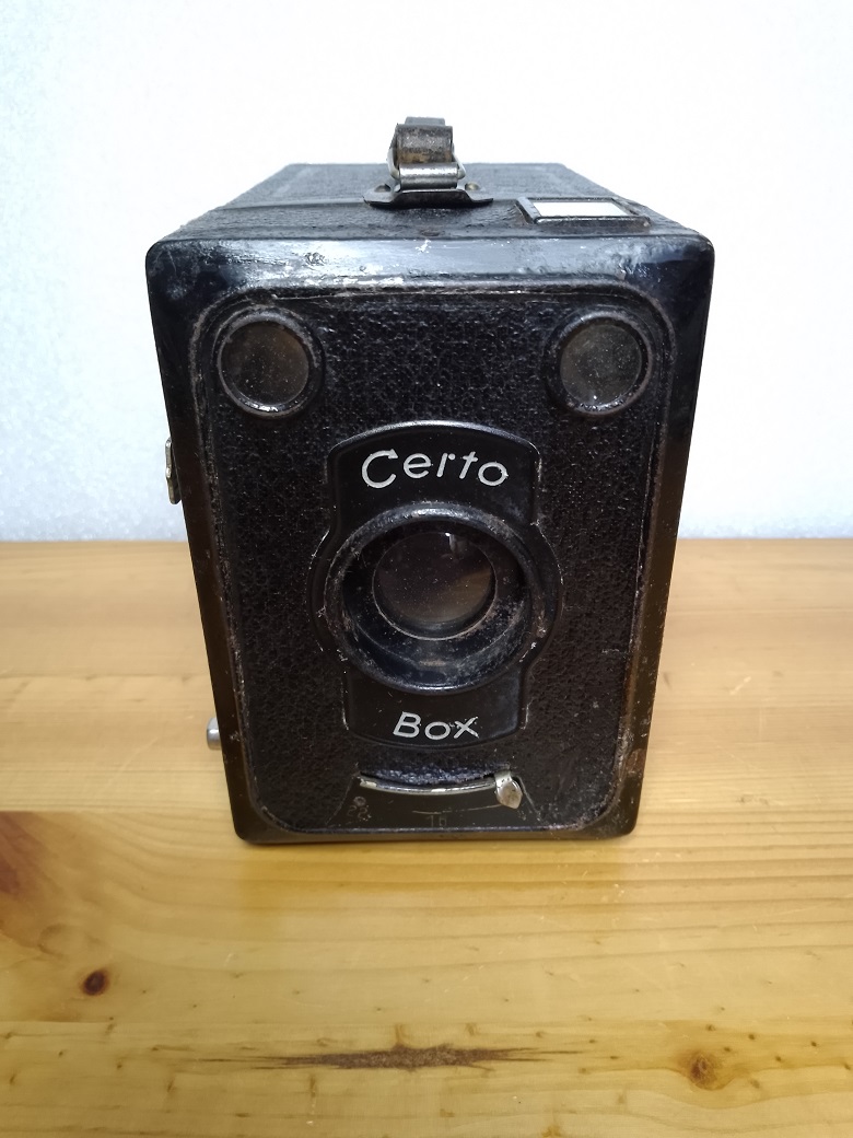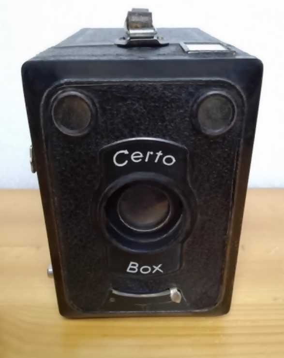 Certo Dresden brachte 1935 die "Certo Box" für den 120er Rollfilm heraus. Der Apparat belichtet Negative im Format 6 x 9 und somit stehen dem Fotografen 8 Aufnahmen zur Verfügung (Certo bot auch eine "Doppel-Box" für die Formate 6 x 9 und 45 x 6 an). Ausgerüstet wurde die "Certo Box" mit einer einfachen Linse oder mit der etwas besseren "Certomat" Linse (letztere erkennbar am Schriftzug um die Linse herum). Das vorgestellte Exemplar verfügt über die einfachere Linse.