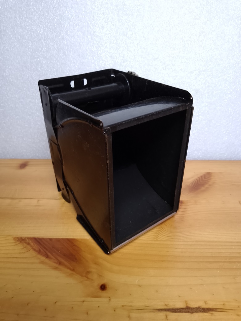 Zum Laden / Entladen der Kamera wird die Verrigelung vor dem Trageriemen leicht angehoben und das, an einem Scharnier befindliche, Vorderteil abgeklappt. Danach kann der Einsatz herausgenommen werden. Leider fehlt bei dieser Kamera eine der Umlenkwalzen.