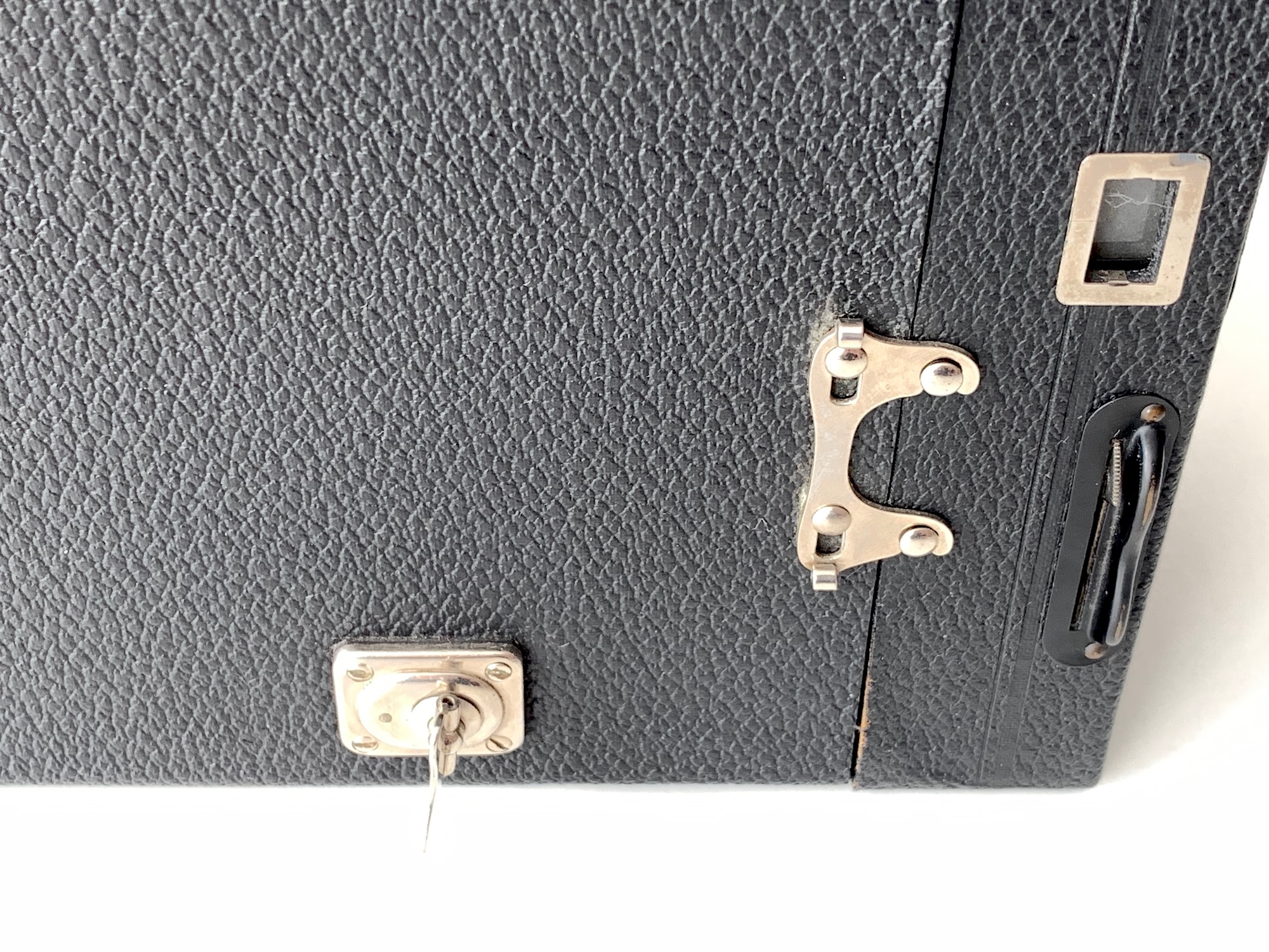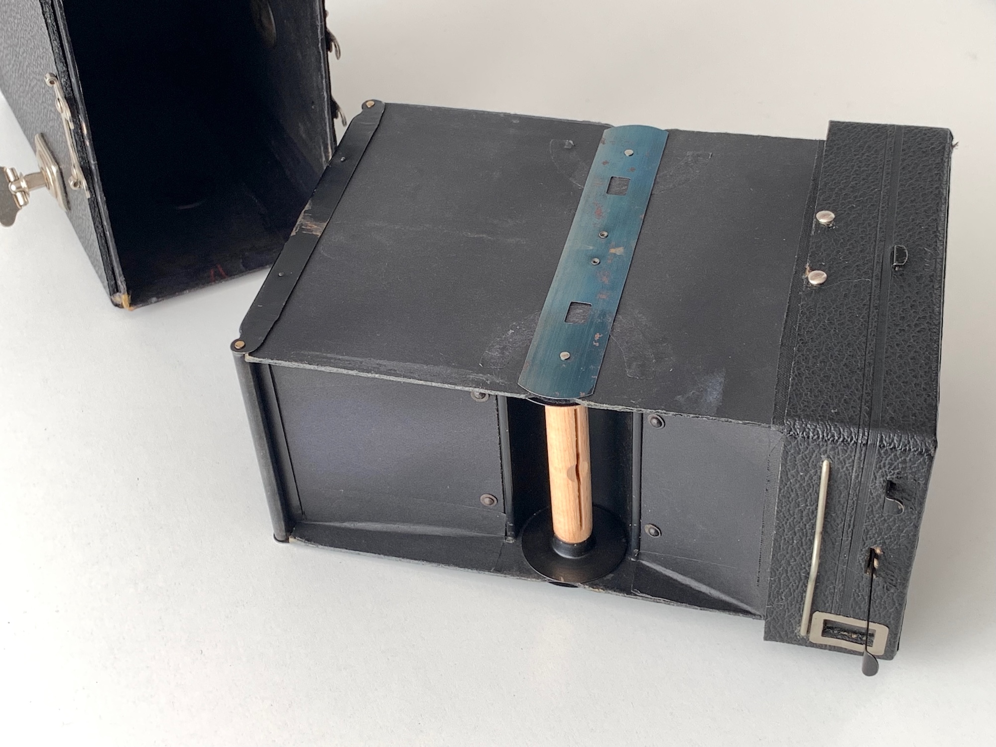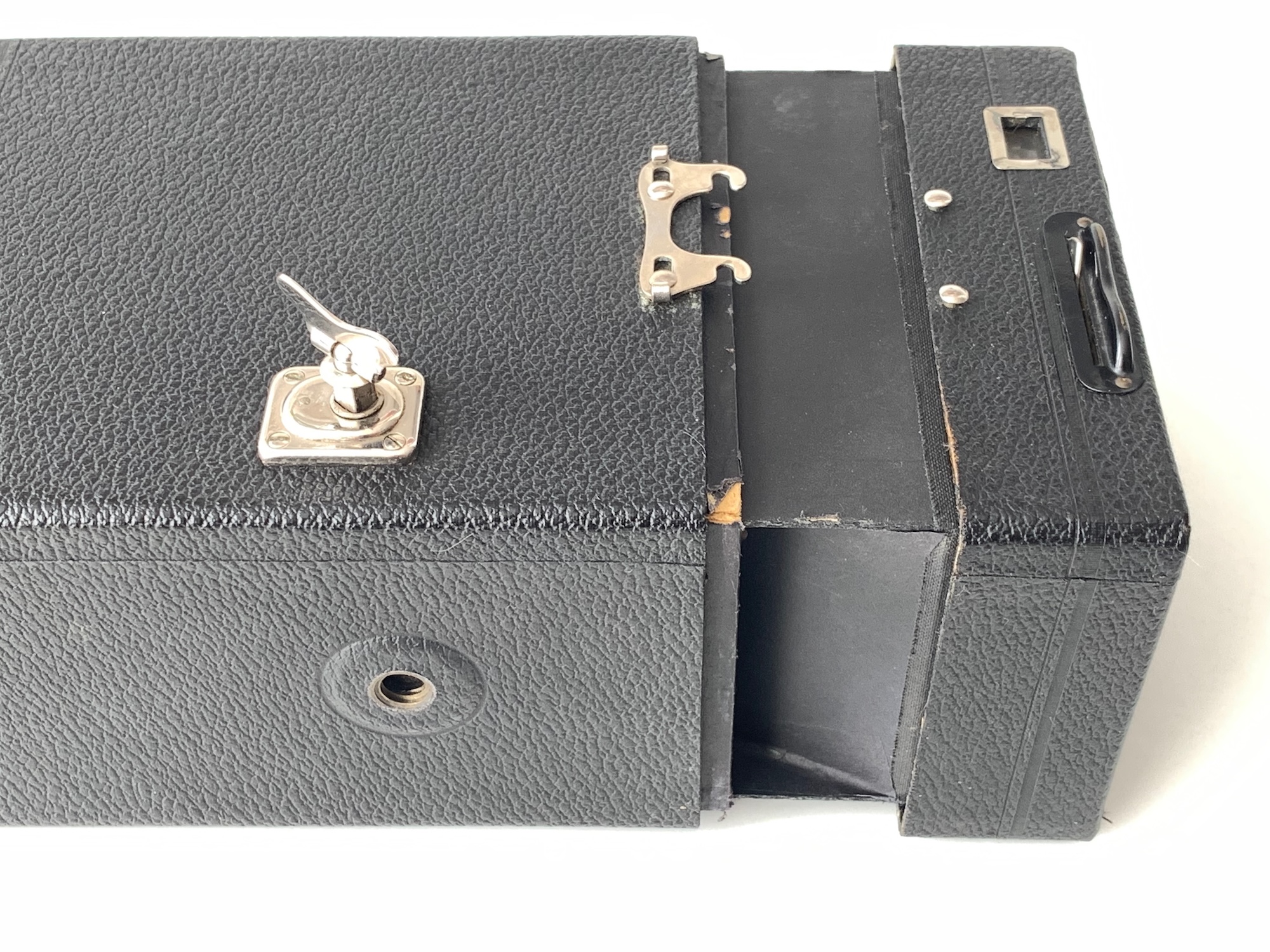 Es handelt sich um eine Boxkamera mit geteiltem Gehäuse aus doppelter starker Pappe, überzogen mit schwarzem Kunstleder. Die Kamera ist recht groß dimensioniert (Maße: 19 x 9 x 13,5). Verwendet wird der Rollfilm D-6 (Kodak 118) für 6 Aufnahmen 6,5x11. Das Vorderteil mit Filmeinsatz ist beidseitig verriegelt und kann herausgezogen werden.