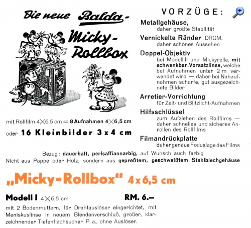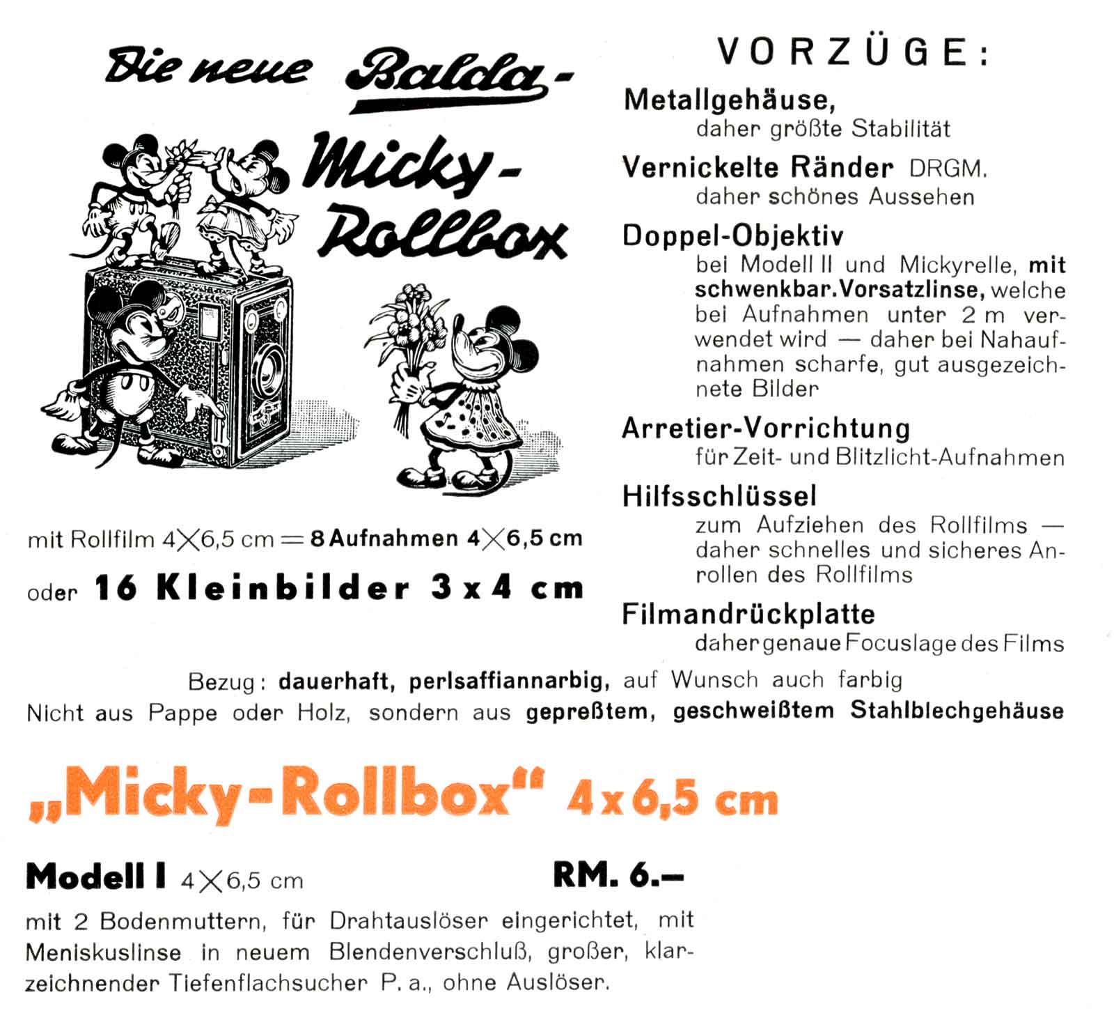 Der Unterschied zwischen den genannten drei Balda Rollfilm-Boxkameras für 127er Rollfilm ist im Grunde ganz leicht erklärt: die Micky Rollbox Modell I ist die Basisvariante, die Micky Rollbox Modell II besitzt zusätzlich eine einschwenkbare Nahlinse und die Mickyrelle konnte durch Verwendung einer Einlegemaske und mittels zweier Rotfenster zusätzlich noch das Aufnahmeformat 3x4 belichten. Die allgemeinen Ausstattungsmerkmale der Boxkamera können dem folgenden zeitgenössischen Katalogauszug entnommen werden:
