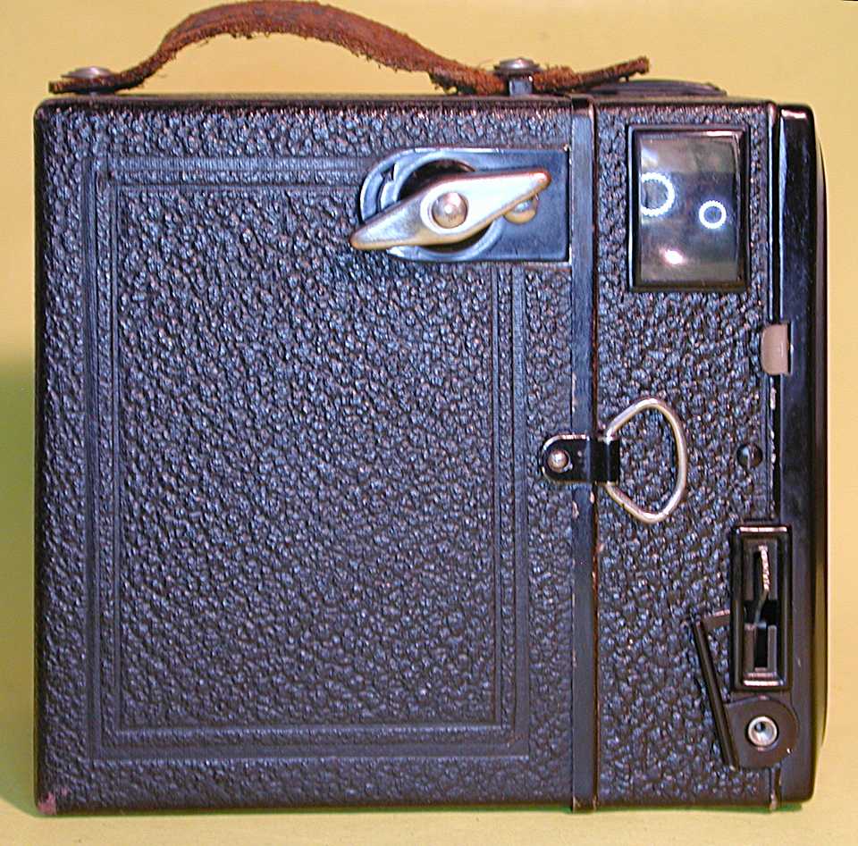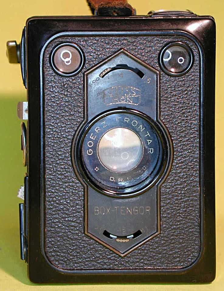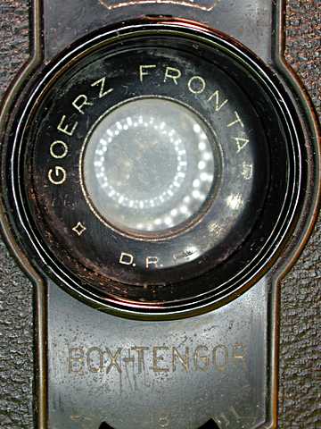 Hersteller, Modell: Zeiss Ikon Box Tengor 54/2 "later", "6-eck Front" Baujahr: 1928 - 1931 Gehäuse: 2-teilig (sehr hakelige Sache und nicht einhändig zu öffnen, im Gegensatz zur Ensign "All Distance"), Leergewicht 533 Gramm Objektiv: Goerz-Achromat mit Lichtstärke 11; Brennweite als 110 Millimeter berichtet Blenden: 11, 18 und 25 (Lochblenden einschwenkbar) Entfernungseinstellung: durch einschwenkbare Vorsatzlinsen, rastend und daher nur 1.5 Meter, 4 Meter und Unendlich Verschluss: Zeitaufnahme "B" Funktion, betätigt durch einen herausziehbaren Schieber mit Aufschrift "T", leicht unbeabsichtigt zu aktivieren, da Stellung nicht gekennzeichnet; "T" Funktion über Verriegelung möglich; Momentaufnahme, übereinstimmend und plausibel als 1/25 Sekunde genannt Auslöser: nach unten zu betätigen, selbstspannend, verriegelbar (die Verriegelung ist leicht aus Versehen zu aktivieren, da sehr leichtgängig), Drahtauslöseranschluß. Keine Doppelbelichtungssperre, kein Leerlaufschutz Blitz: nein Belichtungsmesser: nein Filmzählwerk: ja, auf Film. Rotes Sichtfenster nicht verschließbar Sucher: zwei Brillantsucher 14x20 Millimeter (immerhin) für Hoch- und Querformat Filmtransport: Knebel zum Drehen Format und Film: Acht Aufnahmen 6 x 9 cm auf Rollfilm 120. Blitz: nein Belichtungsmesser: nein Filmandruckplatte: keine (?!), Nachspannen vor Auslösung ist anzuraten Sonstiges: Zwei Stativgewinde 3/8 Zoll für Hochformat- und Quer-Aufnahmen Neupreis: typischerweise 11,75 Reichsmark