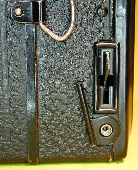 Rechts unten die Verriegelung des Auslösers, hier offen. Sie geht leicht von selber zu und dürfte so manchen Schnappschuß verhindert haben.