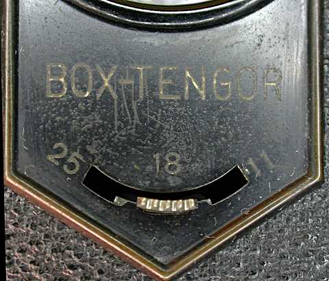 die Zeiss Tengor hat ein zweilinsiges Objektiv (Goerz-Achromat) und verstellbare Entfernung, realisiert durch einschwenkbare Korrekturlinsen. Meine identifiziere ich als "Modell 54/2 later", ein frühes (aber nicht das erste) Modell der Baureihe, und von Forenmitglied sepplbauer prägnant mit dem Zusatz "6-eck Front" bezeichnet. Ihre Blendenreihe 11-18-25 anstatt ab 1932 11-16-22 qualifiziert sie als frühes Modell. Da sie zwei obenliegende Sucher-"Augen" hat, ist sie nicht vor 1928 entstanden. Von den Abbildungen in sepplbauer's Datenblatt unterscheidet sie sich u.a. dadurch, dass das "F" von "Frontar" in der Objektivbeschriftung oben ist, von Rainers und sepplbauer's 54/2 durch die Befestigung des Tragriemens, der bei diesen durch einen Bügel oben ganz an der Front läuft, bei meiner längs mit zwei runden Knöpfen, die weiter hinten nur an dem abnehmbaren Rückteil festgenietet sind, befestigt ist. Das entspricht z.B. den 756, 760 und 54/14 Modellen. Einzigartig ist bei dieser Tengor die Entfernungsskala, die auf 1.5 Meter, 4 Meter und Unendlich lautet; alle anderen Abbildungen und Katalogbilder, die ich finden konnte, sind mit einem Entfernungsbereich beschriftet, die hier im Forum 1-2 Meter, 2-8 Meter und 8 Meter bis unendlich.