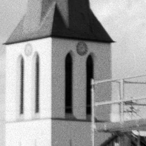 Von 6x9 Boxkameras wurden normalerweise Kontaktkopien gemacht. Die Tengor (und übrigens auch die Ensign All Distance) erlaubt durchaus Vergrößerungen. Ein Hauch von Auflösung an den Dachziegelreihen im Streiflicht sowie eine Ahnung der vergoldeten Markierungen des Zifferblattes im Schatten ist noch auszumachen.