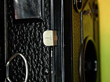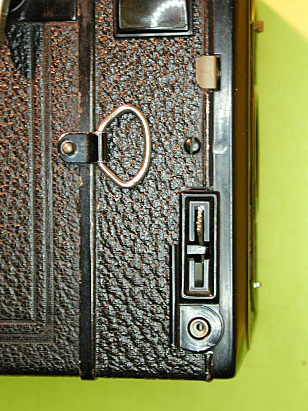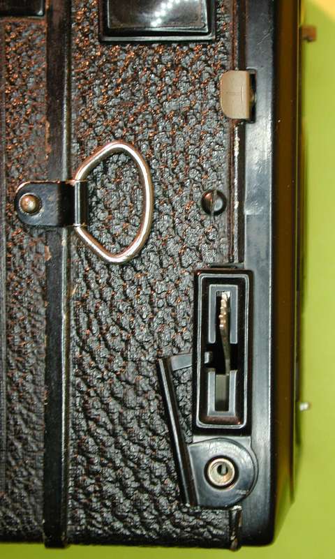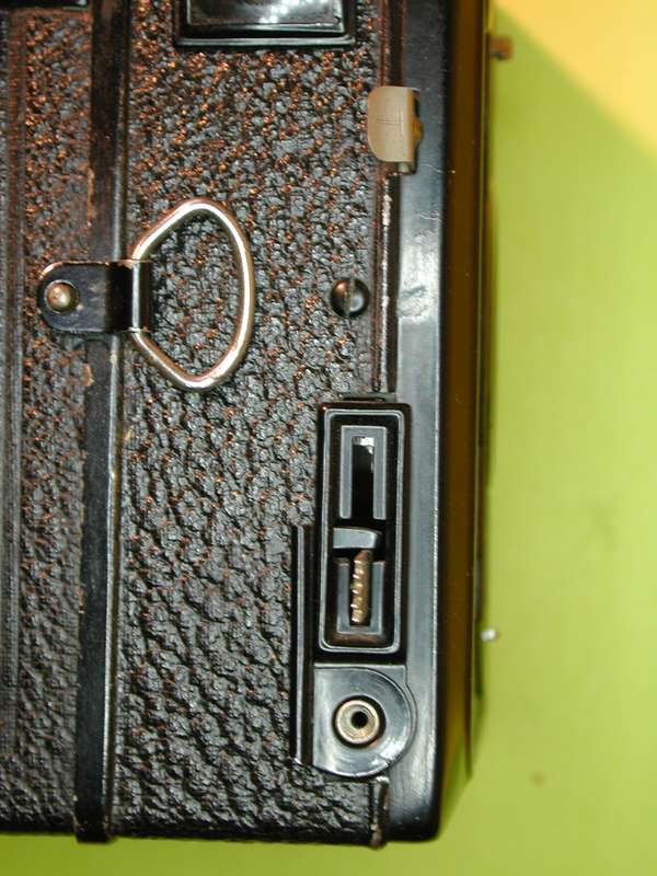 Der Knebel für den Filmtransport kann nicht verkehrt herum gedreht werden. Seine Grundplatte sitzt übrigens am Vorderteil der Kamera. Um an die Filmspulen zu kommen, muss man mit einer Hand den D-Ring ziehen und halten, um mit der anderen das Rückteil abzuziehen. Zum Wiederaufsetzen muss es zwischen die Bleche der Lichtfalle eingefädelt werden. Für Zeitaufnahmen gibt es Stativgewinde und Drahtauslöseranschluß (Bild). Nur dann darf auch der Schieber rechts unten an dem Sucherfenster herausgezogen sein!