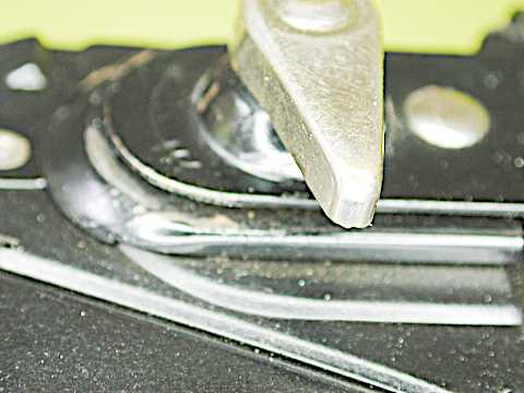 Hier greift, wenn der Sucher eingefahren ist, der Draht links in den Auslösehebel ein, der rechte ist ohne Funktion