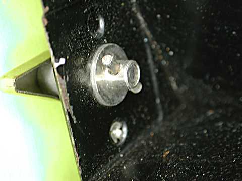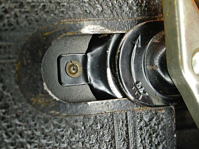 Links verborgen unter der Belederung zwar ein gleichartiges Loch, in das ein gleich dicker kurzer Pin einrasten würde, aber es gibt keinen, sondern eine Blechzunge, die wahrscheinlich der Befestigung von etwas ganz anderem dient: