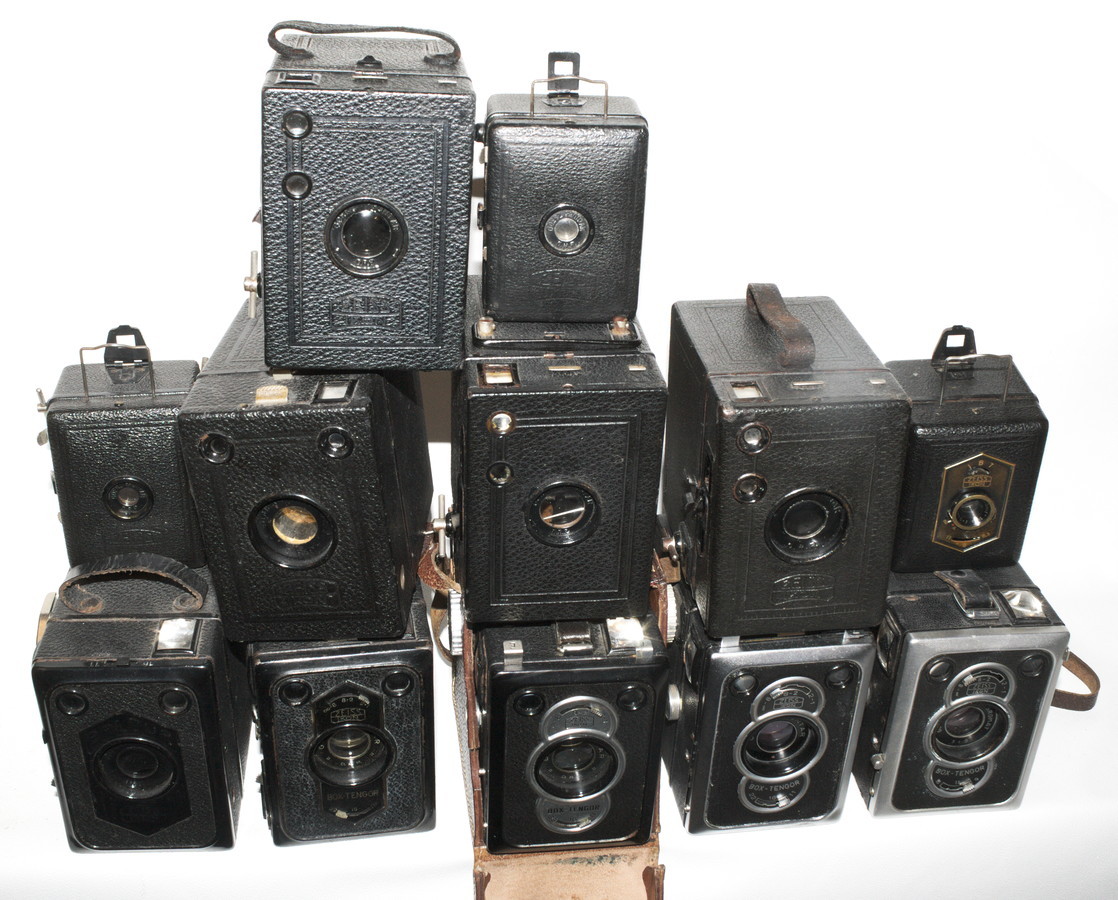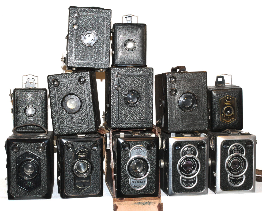 Obere Reihe zwei "Übergangsboxen": 756/2 (baugleich zur Goerz-Box ausser dem querliegendem Lederriemen statt Drahtbügel), 54/18(Babybox, noch ohne Auslösesperre, sehr ungewöhnliches Visier. Prototyp bis Übergangsmodell von Ur-Babybox auf das erste Großserienmodell).