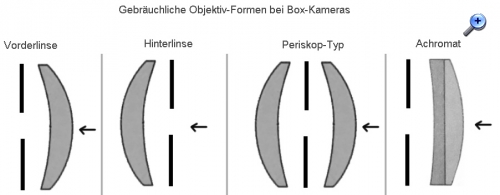 Das übliche Objektiv war zuerst die Meniskus-Linse, eine kombinierte Konkav / Konvex - Linse mit unterschiedlichen Krümmungsradien der Flächen. Dieser Linsentyp wurde nur mit stärkerer Abblendung praktikabel, weil so auch die Verzeichnung verringert wurde.
