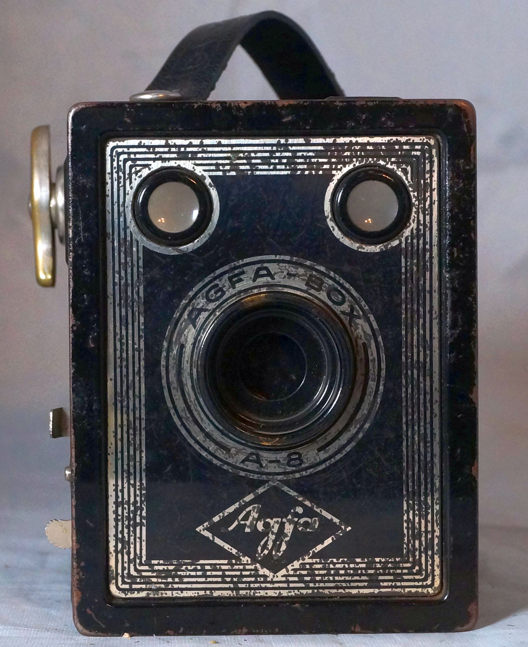 und heute wieder eine Agfa Box, die Box 41, auch als Box a-8 oder Cadet A-8, die, soweit mir bekannt ist, einzige Agfa Box für 127 Rollfilm oder auch unter der Bezeichnung A-8 von Agfa vertrieben, daher auch der Name. Es gibt die Box wohl in verschiedenen Ausführungen einmal mit dem Schriftzug Agfa Cadet A-8 oder wie bei mir Agfa Box A-8.