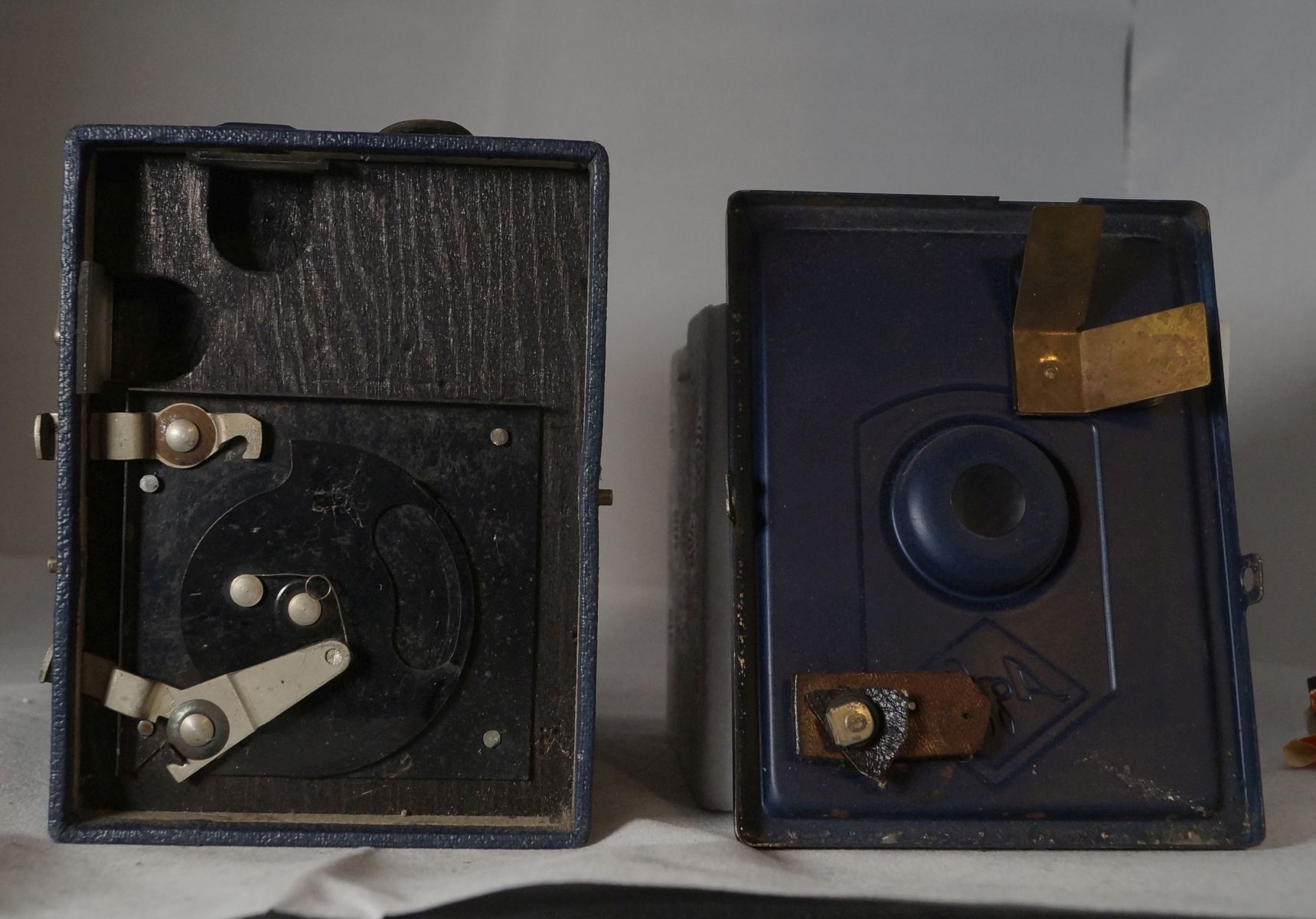 Hallo, von innen unter die Lupe genommen schaut es schon etwas selbstgemacht aus. Das breite Stück ist übrigens sehr dickes Leder, der Rest scheint nur zum auffüllen des Zwischenraums zu sein, so das das Lederstück Fest mit dem Hebel verbunden ist. Nach unten gedrückt scheint das ganze den Verschluss zu Blockieren, wobei er sich trotzdem etwa zu einem drittel öffnet, aber es ist gut möglich das das Leder früher etwas größer war und geschrumpft ist. Wenn das der Fall war, denke ich das es zum Blockieren des Verschlusses gedacht war, eine Zeitverzögerung halte ich für unwahrscheinlich, da es den Verschluss komplett blockiert. Selbstauslöser denke ich auch nicht, dann müsste es ja eine Art automatischer wiederfreigabe geben. Ich frage mich halt, warum jemand das an einer solchen Kamera machen sollte, der Verschluss löst ja nicht leicht oder zufällig aus, ausserdem ist es ja nicht eben eine hochwertige Kamera, sondern am ehesten von ideellen Wert für den ehemaligen Besitzer, da es ja eine Belohnung für besondere Leistungen war. In jedem Fall eine Kuriosität Und weil sie Kurios ist habe ich gleich noch eine geschossen, im Originalzustand konnte einfach nicht wiederstehen, ich habe irgentwie das Gefühlt meine Sammlung wird nach und nach immer Box lastiger :-) .