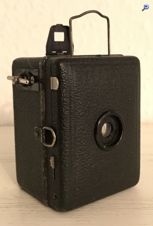 - 4) Baby-Box. "Luxus-Variante" mit Novar-Anastigmat 1:6,3, Verschluß B, M, T. 3 Blenden, Entfernungseinstellung. Sucherbügel mit Ausziehnase.