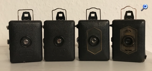 - 3) Baby-Box ***. Frontseite mit langezogenem Rautenlogo um Objektiv und Zeiss-Ikon-Logo. Goerz Frontar-Objektiv. 1:11 . Sucherbügel mit Ausziehnase. Vier Filmführungsrollen.