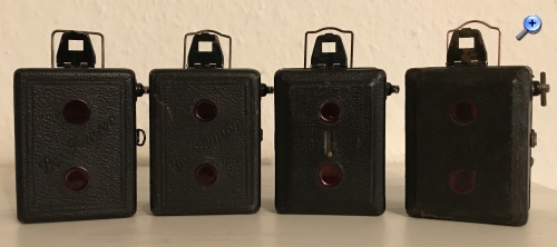 - 4b) Baby-Box. "Luxus-Variante" mit Novar-Anastigmat 1:6,3, Verschluß B, M, T. 3 Blenden, Entfernungseinstellung. Sucherbügel mit Ausziehnase. Abdeckbare Bildzählfenster mittels kleinem Schieber zwischen den Bildzählfenstern (für Nutzung von panchromatischen Filmen).