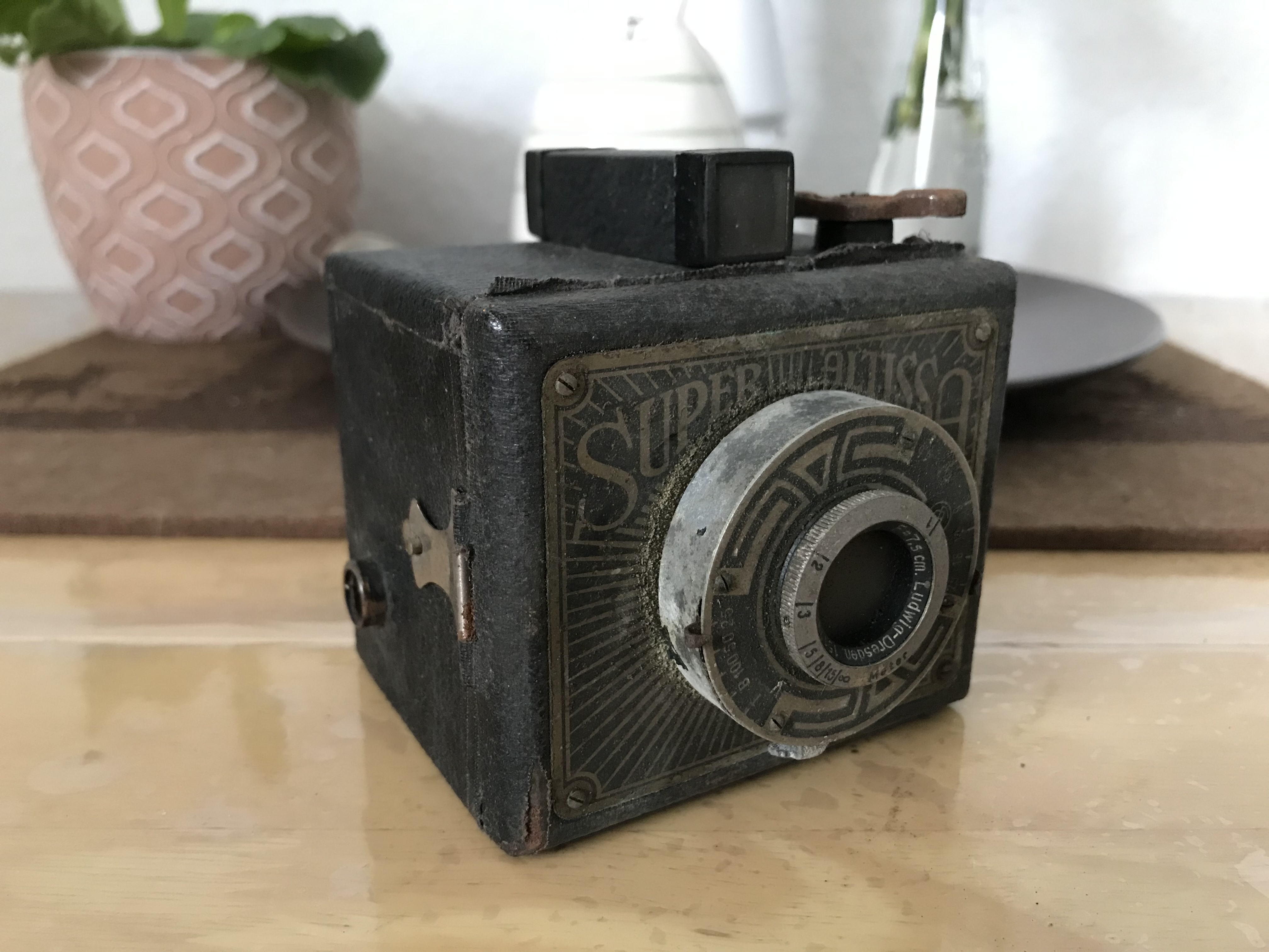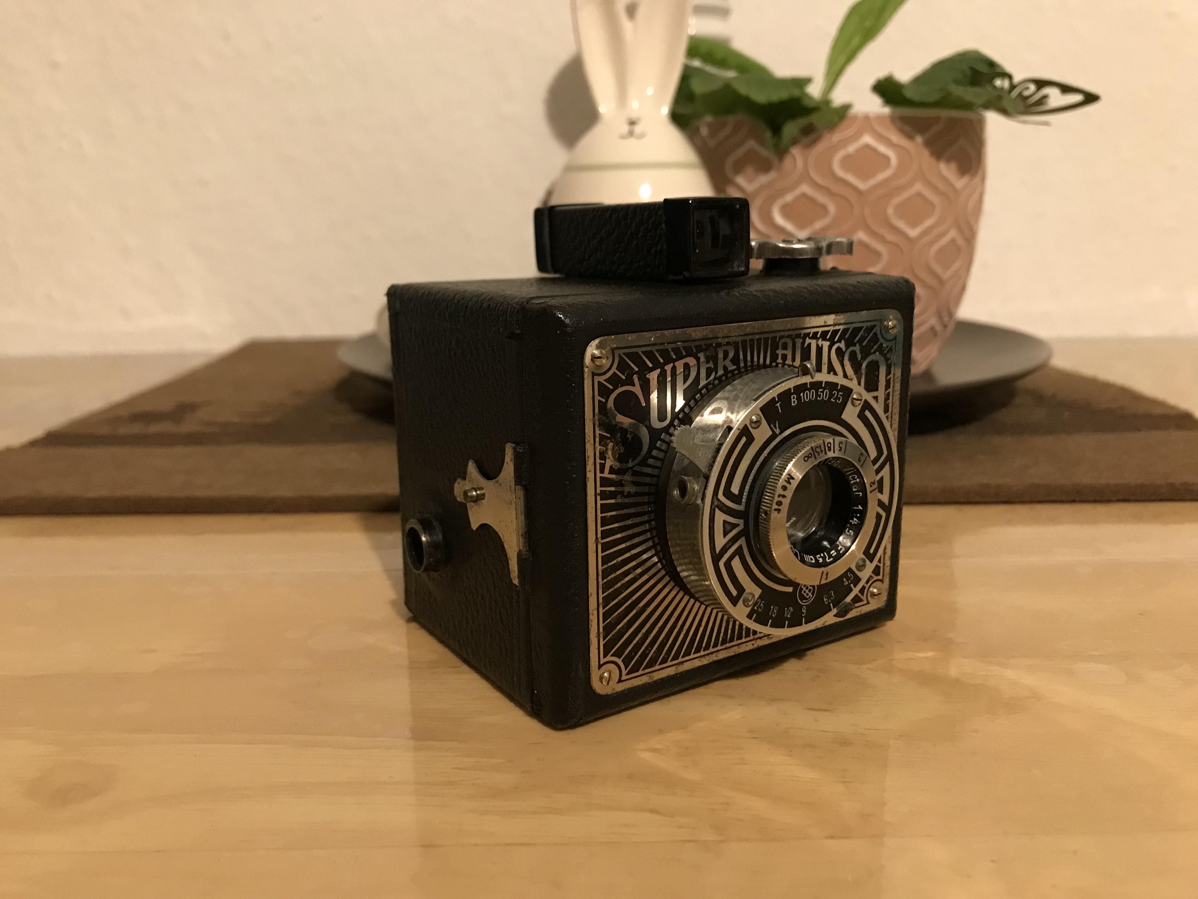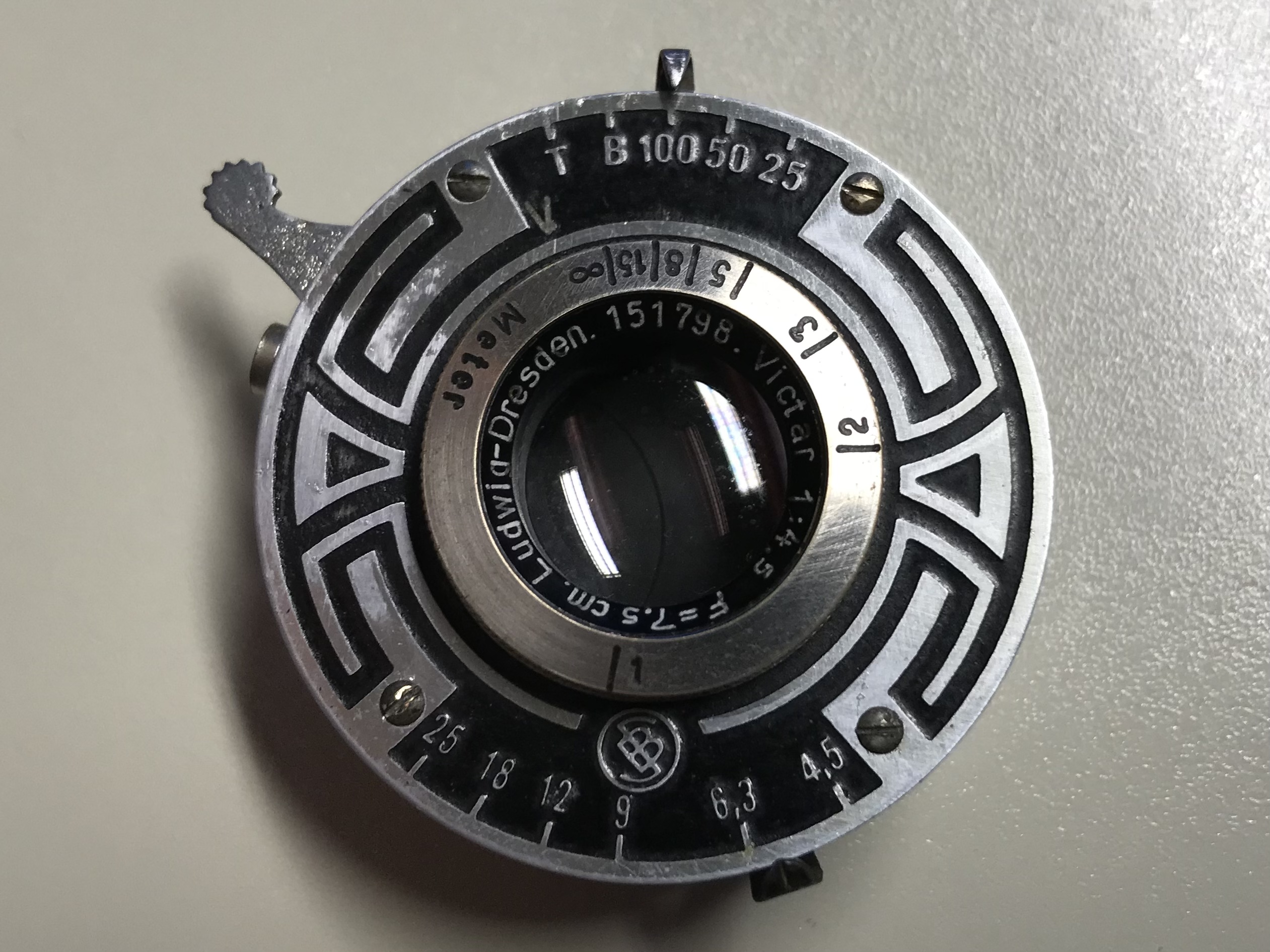 Was sie aber, so Hans-Dieter Götz in seinem schönen Buch „Box-Kameras Made in Germany“ (2002) „bereits in eine andere Klasse“ einordnet (S. 35), ist vor allem die lichtstarke Optik: ein dreilinsiges (freilich unvergütetes) Objektiv von E. Ludwig, Dresden (Victar 1:4,5) mit den Blendeneinstellungen 4,5, 6,3, 9, 12, 18 und 25 (!), den Zeiten 1/25, 1/50, 1/100, B und T und einem Fokusbereich von 1m bis ∞. Es handelt sich also um eine sehr kleine, aber vollwertige Rollfilmkamera für das Format 6x6 (Film 120). Eine leichte Begleiterin der 1930er-Jahre also für Ausflüge und Sonntagsspaziergänge versierter Amateure (oder Damen?), die anders als die ‚Box-Knipser‘ nicht davor zurückschreckten, vor dem Auslösen an der Kamera ein paar Einstellungen vorzunehmen.