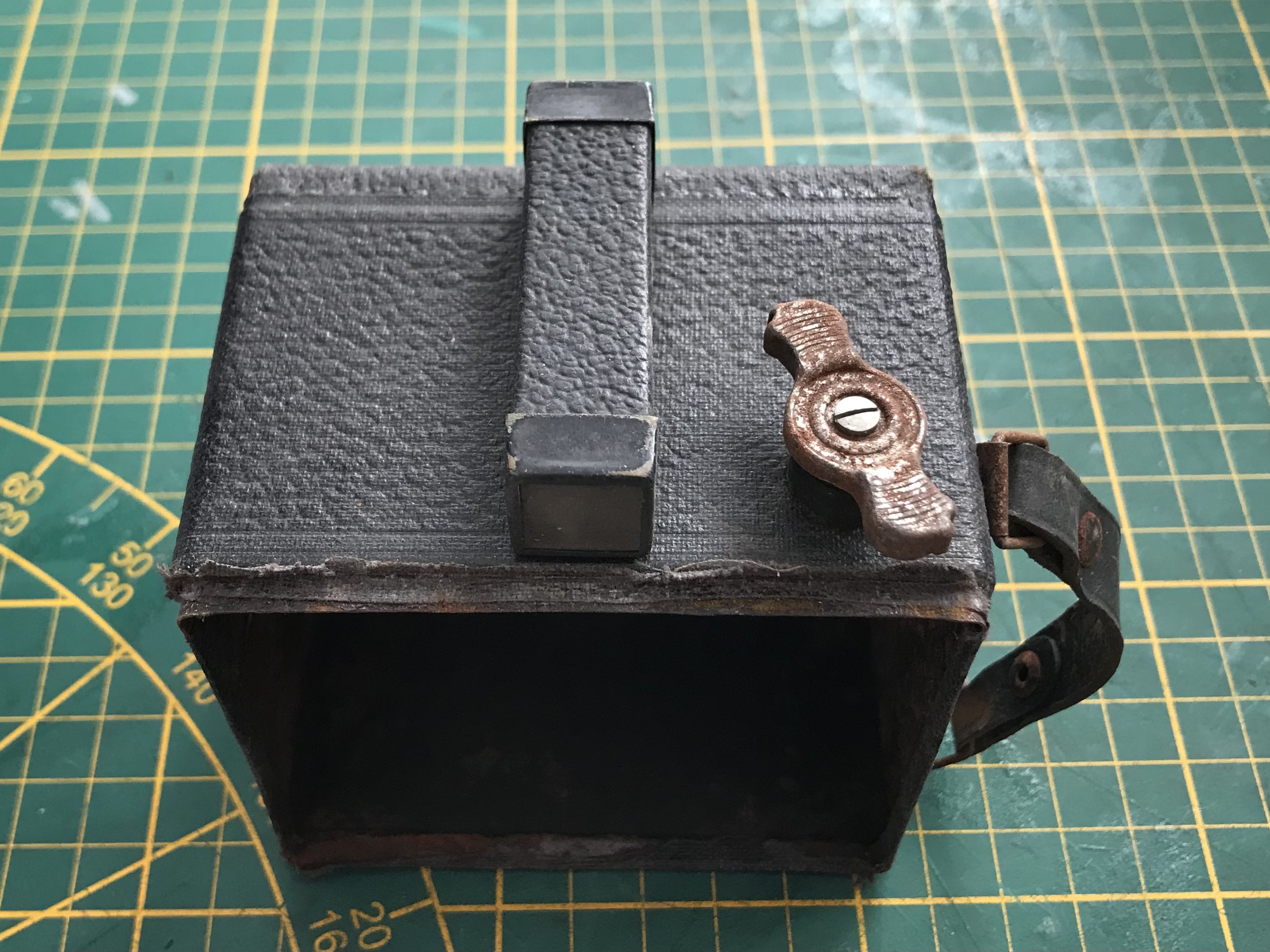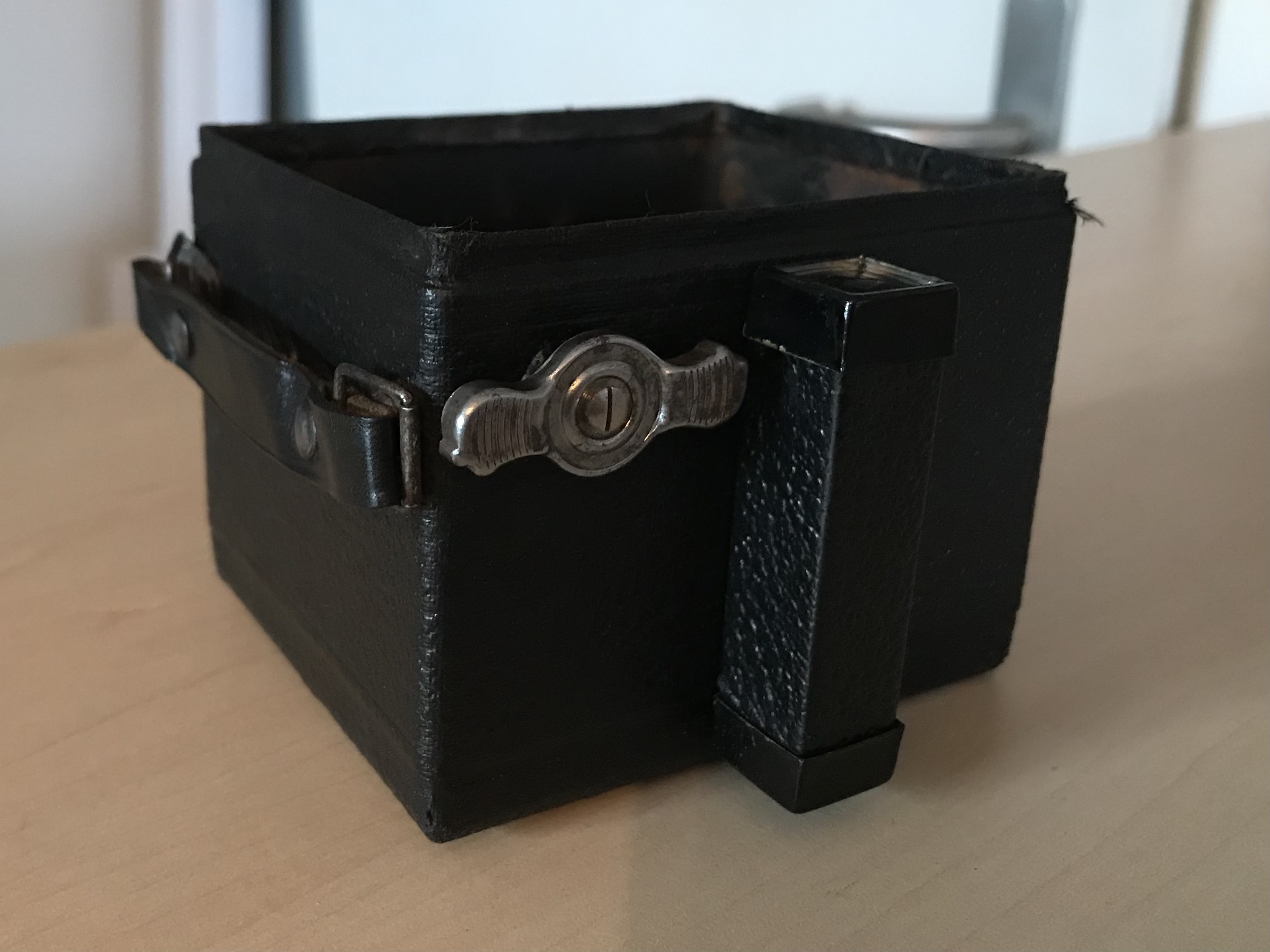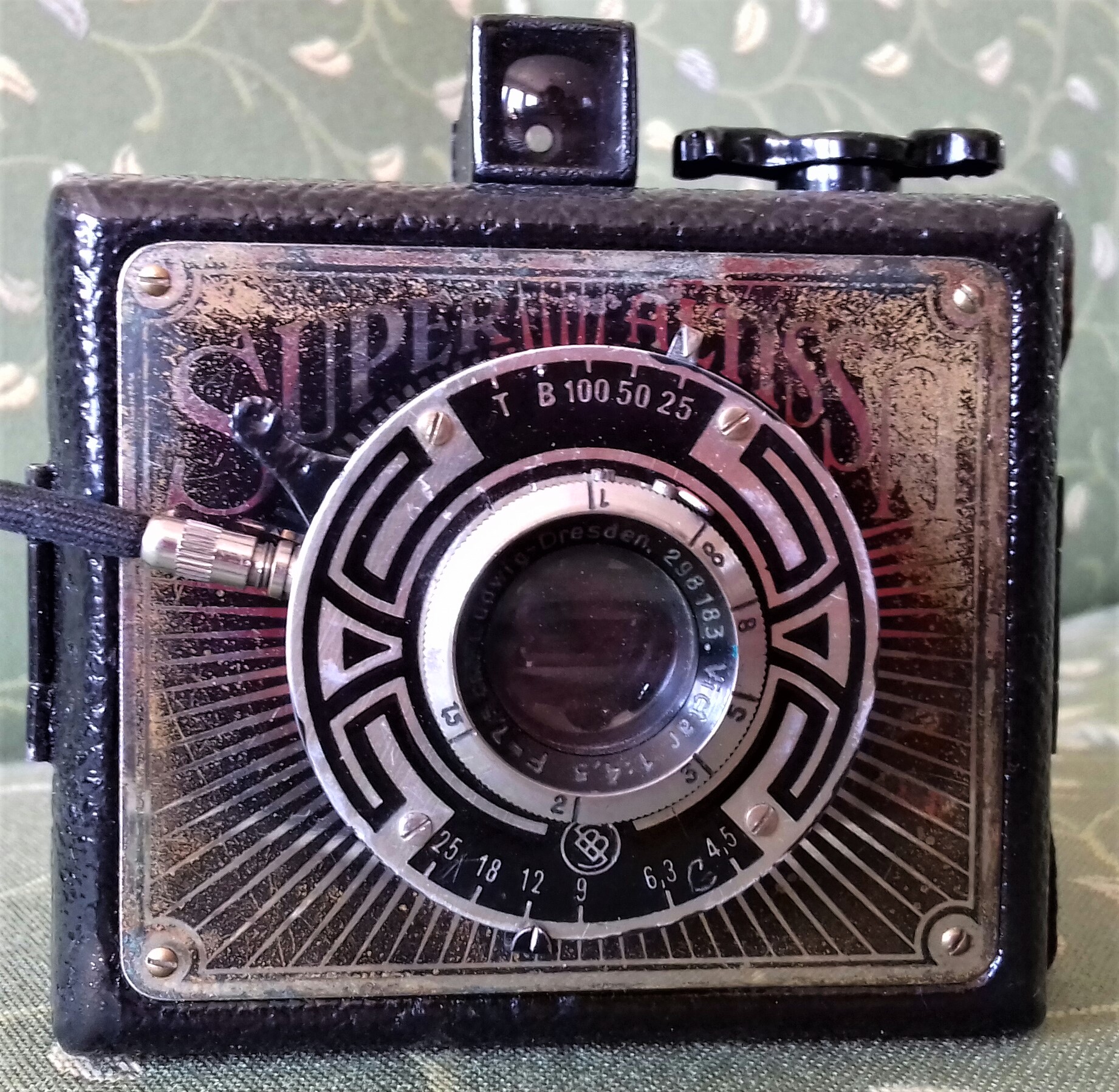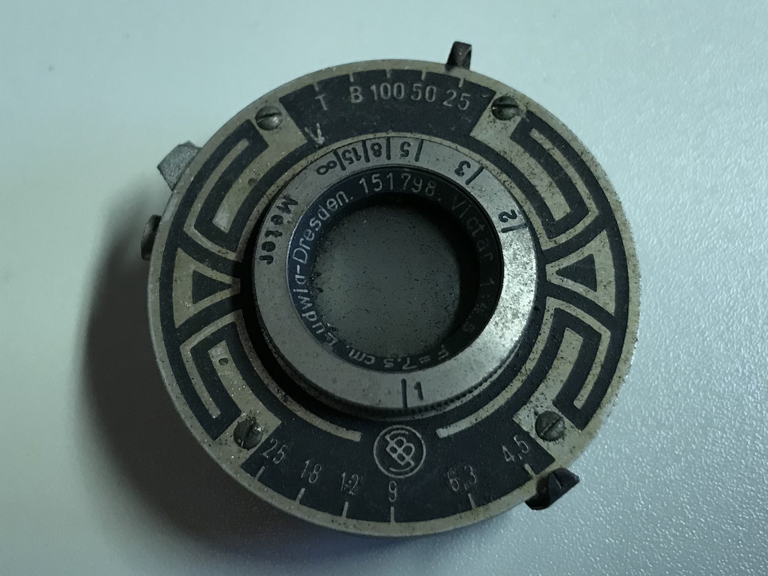 Was sie aber, so Hans-Dieter Götz in seinem schönen Buch „Box-Kameras Made in Germany“ (2002) „bereits in eine andere Klasse“ einordnet (S. 35), ist vor allem die lichtstarke Optik: ein dreilinsiges (freilich unvergütetes) Objektiv von E. Ludwig, Dresden (Victar 1:4,5) mit den Blendeneinstellungen 4,5, 6,3, 9, 12, 18 und 25 (!), den Zeiten 1/25, 1/50, 1/100, B und T und einem Fokusbereich von 1m bis ∞. Es handelt sich also um eine sehr kleine, aber vollwertige Rollfilmkamera für das Format 6x6 (Film 120). Eine leichte Begleiterin der 1930er-Jahre also für Ausflüge und Sonntagsspaziergänge versierter Amateure (oder Damen?), die anders als die ‚Box-Knipser‘ nicht davor zurückschreckten, vor dem Auslösen an der Kamera ein paar Einstellungen vorzunehmen.
