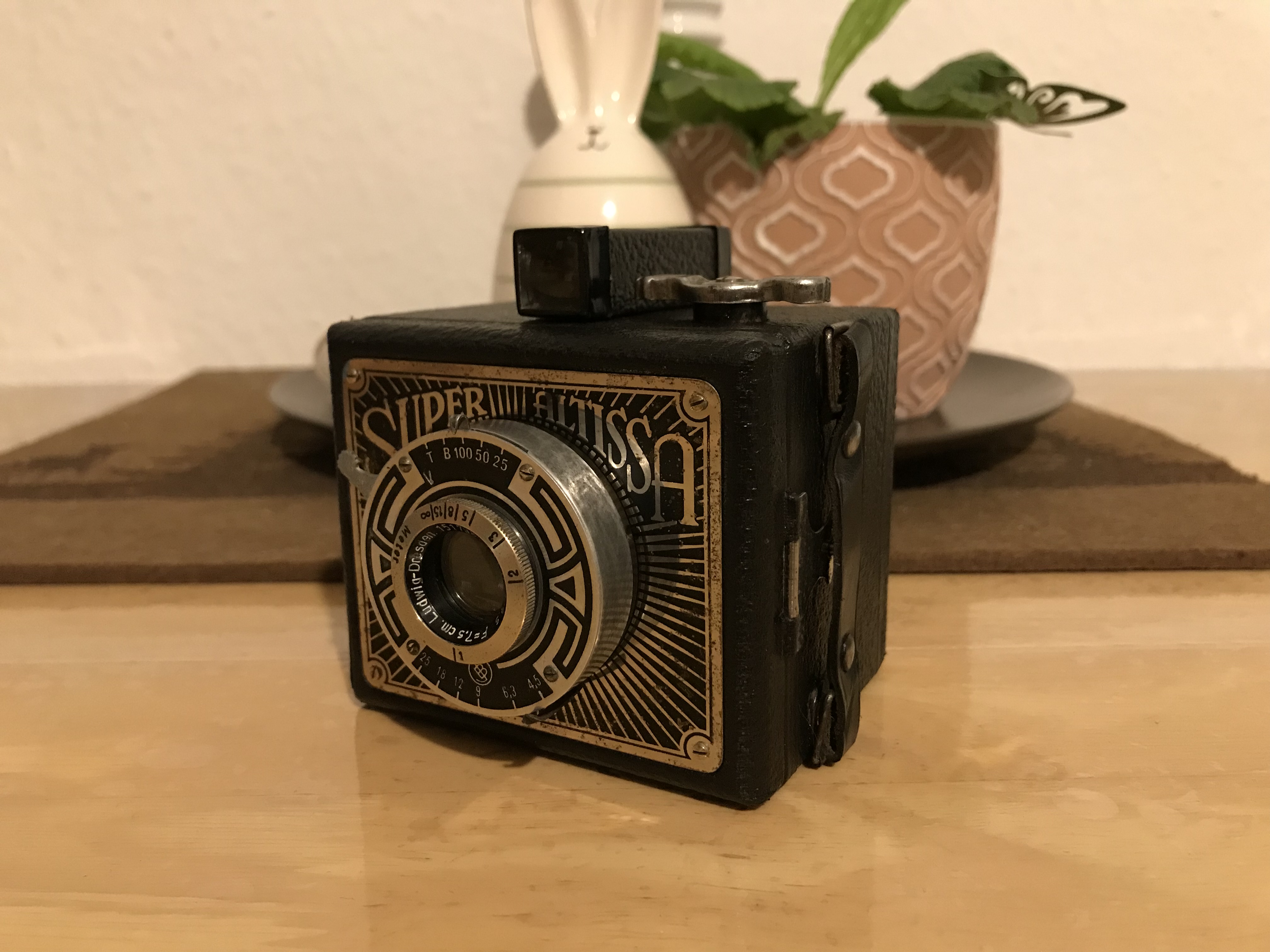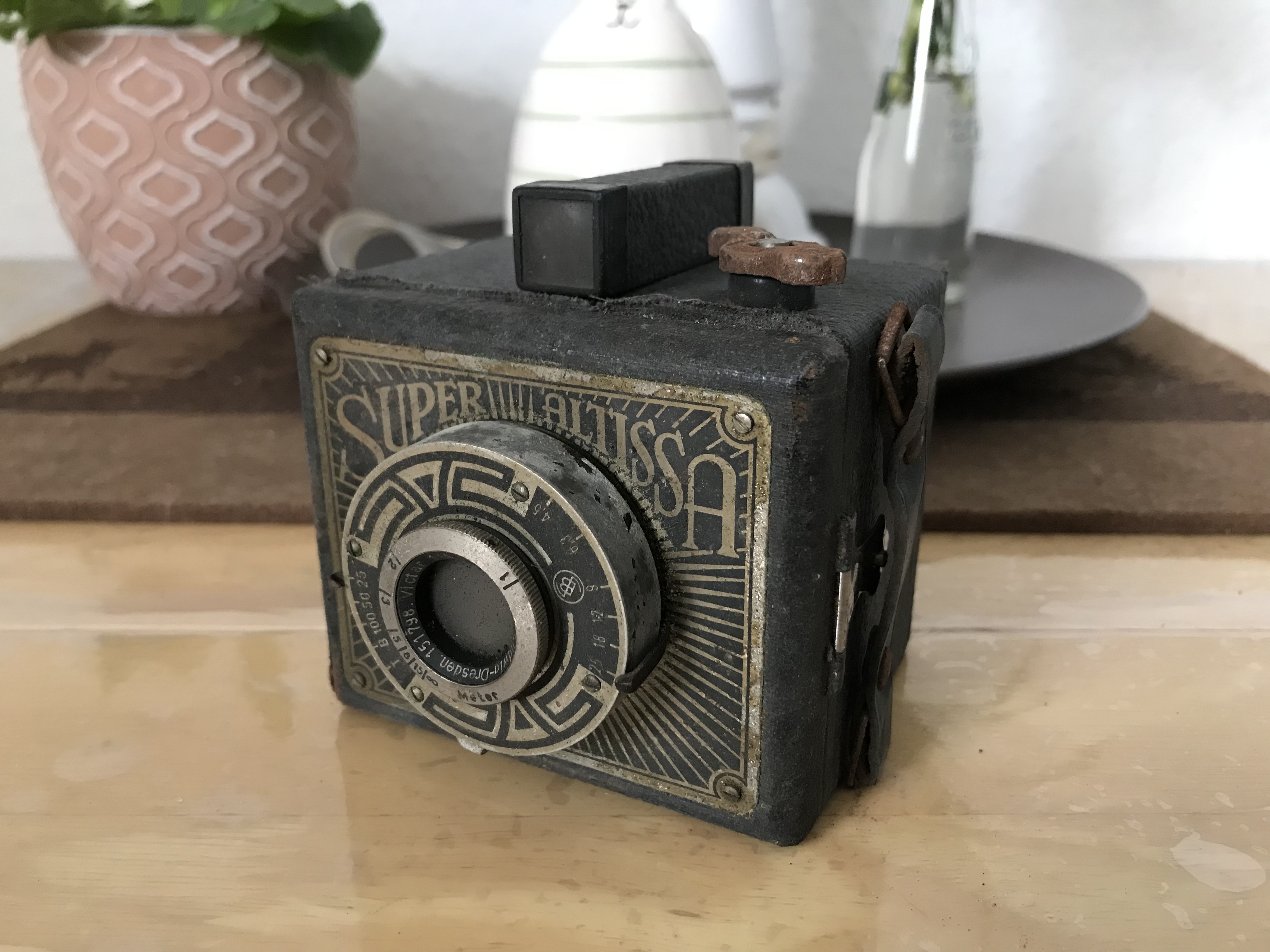Wenn man eine Übergangsstufe zwischen simpler Boxkamera und leistungsfähiger Rollfilmkamera sucht, stößt man auf die „Super Altissa“, eine besonders hübsche Kamera der Dresdner Firma Eho–Altissa aus dem Jahr 1938. Sie hat die sehr kompakten Ausmaße 8,5 x 6,5 x 7cm und wirkt damit fast würfelförmig. Die Art-déco-Frontplatte zieren silberne Sonnenstrahlen und der Schriftzug „Super Altissa“. Anders als die meisten einfachen Boxen der Zeit hat die Kamera einen zielgenauen Fernrohrsucher mit parallaxemindernder Optik.