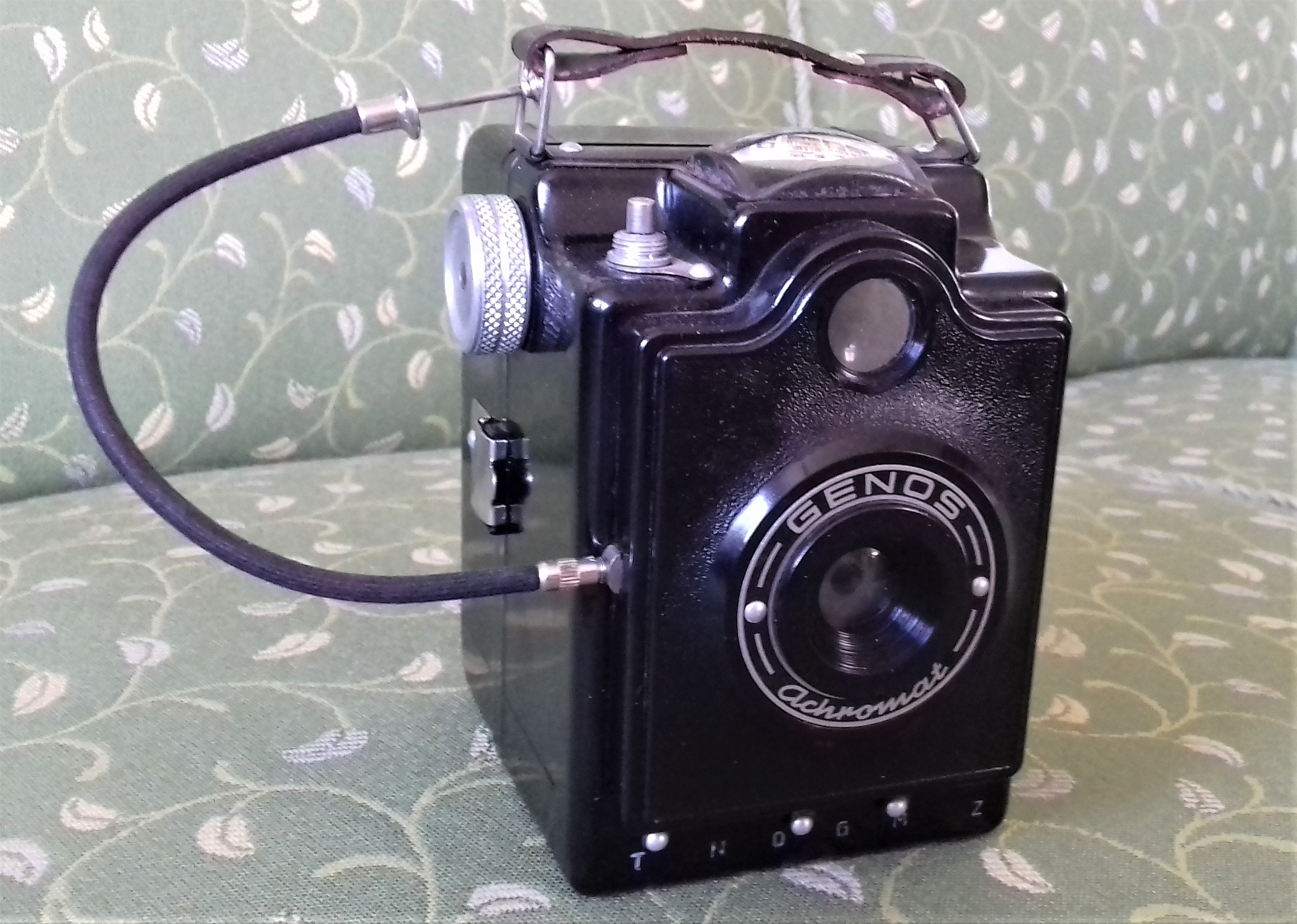 Ein Wunder ist, dass der Bakelit-Korpus nirgends Schäden aufweist. Diese Version hat nicht nur ein Achromat-Objektiv, sondern auch einen Entfernungsring (1,5m bis unendlich), einen Blitz-Synchron-Anschluss, eine Auslösesperre, 2 Blenden, Gelbfilter, Stativgewinde (3/8), eine Lederschlaufe sowie als Besonderheit einen aufklappbaren Sucherschacht (wie bei einer TLR-Kamera), der den großen Brillantsucher auf der Oberseite (Mattscheibe) vor störendem Seitenlicht schützt. Sogar der Spiegel im Inneren funktioniert noch und ist nur leicht beschlagen. Für eine Box-Kamera der frühen 50er-Jahre also eine ganz ungewöhnlich gute Ausstattung. Mit diesem "Top-Modell" ist die Reihe der Genos-Boxen damit komplett.