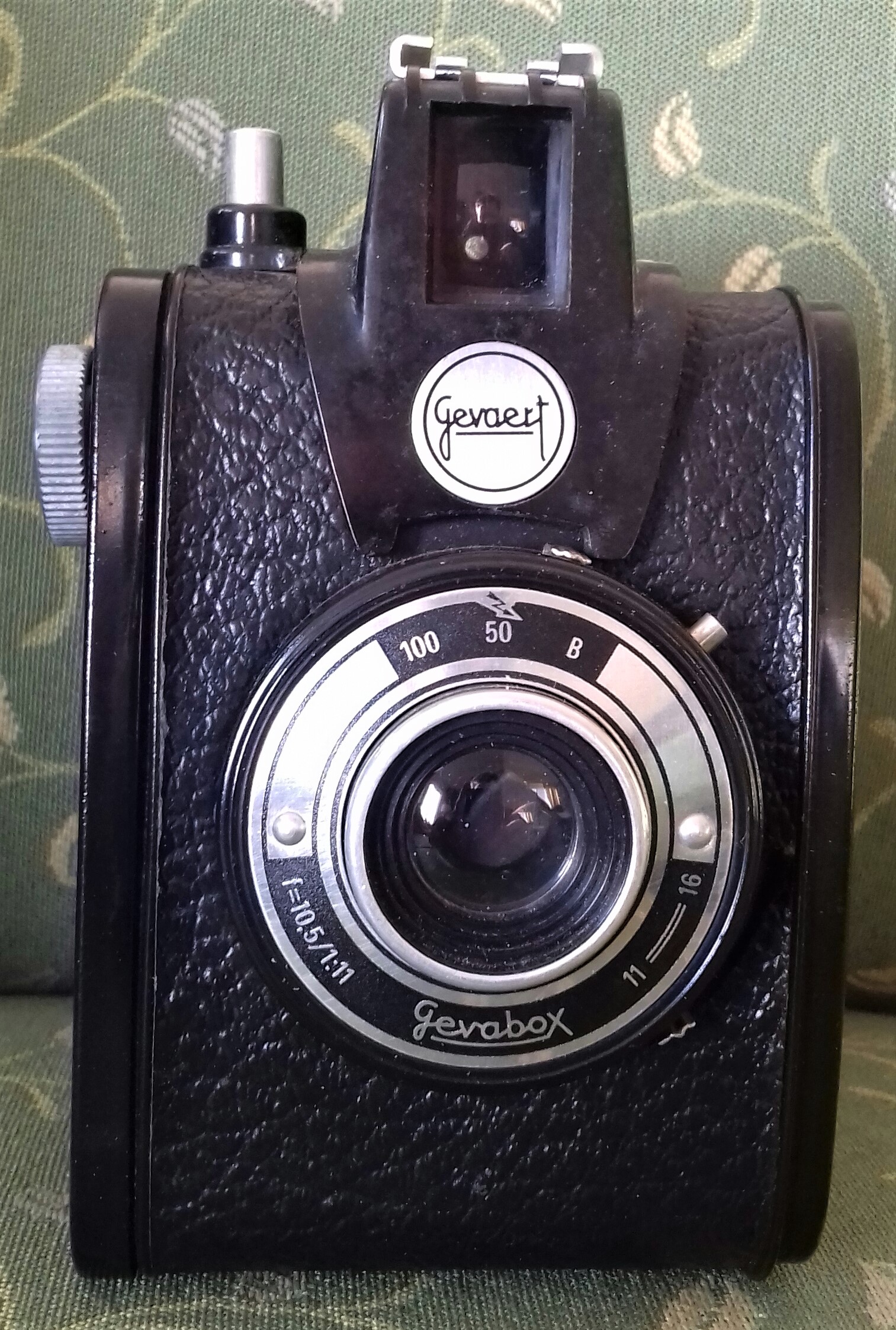 Bei dieser 1953 herausgekommenen „Gevabox“ handelt es sich um eine formschöne Kamera, die von Kürbi & Niggeloh (mit großem eigenen Boxen-Programm bekannt unter der Marke „Bilora“) gefertigt wurde. Die Box besteht aus einem gefälligen belederten Stahlgehäuse mit abgerundeten Ecken. Die Optik ist einfach (Meniskus, f = 10,5 / 1:11, Fixfokus). Der Rotationsverschluss ermöglicht drei Zeiten (B, 1/50 Sek. für Blitzaufnahmen, 1/100 Sek.), und es gibt zwei Blenden (11 u. 16), außerdem ein 1/4-Zoll-Stativgewinde und ein verschließbares Bildnummernfenster. Der Auslöser (inkl. Drahtauslöser-Gewinde) sitzt auf der Oberseite. Die Kamera hat keine Doppelbelichtungssperre.
