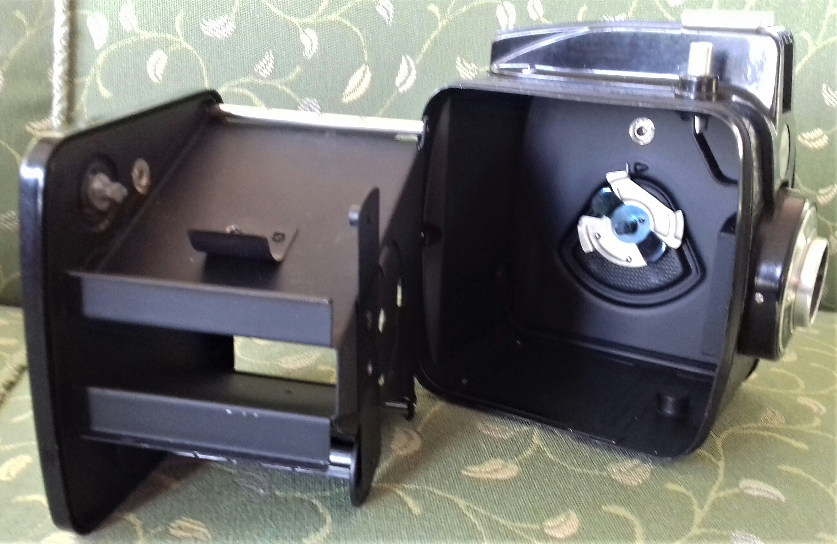 Besonders ist außerdem, dass die Box nicht hinten, sondern seitlich geöffnet wird: Durch Entriegeln der Box mit dem Hebel auf der linken Seite kann rechts die Seitenwand mit dem gesamten Innenleben, d.h. Lichtschacht und Filmhalter, herausgezogen werden. Der Film wird vertikal und plan über zwei Rollen geführt (nicht über eine gewölbte Filmbühne wie z.B. bei der Agfa „Clack“).