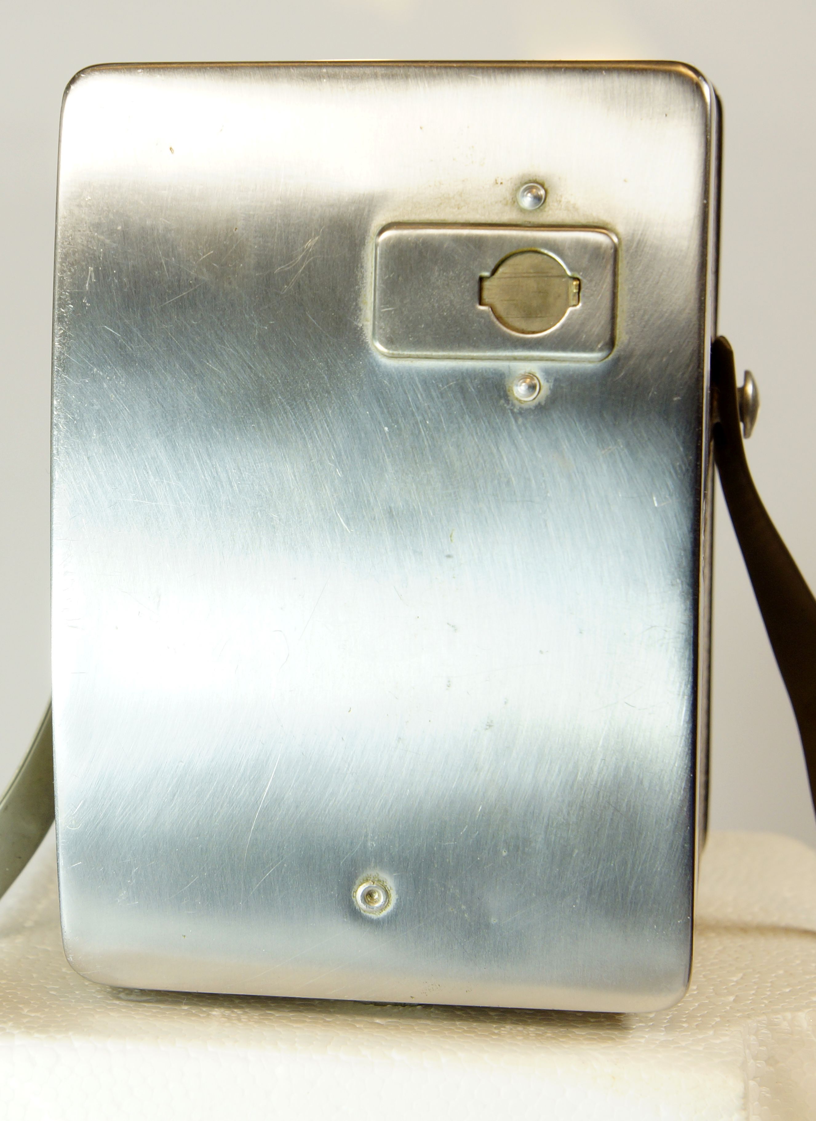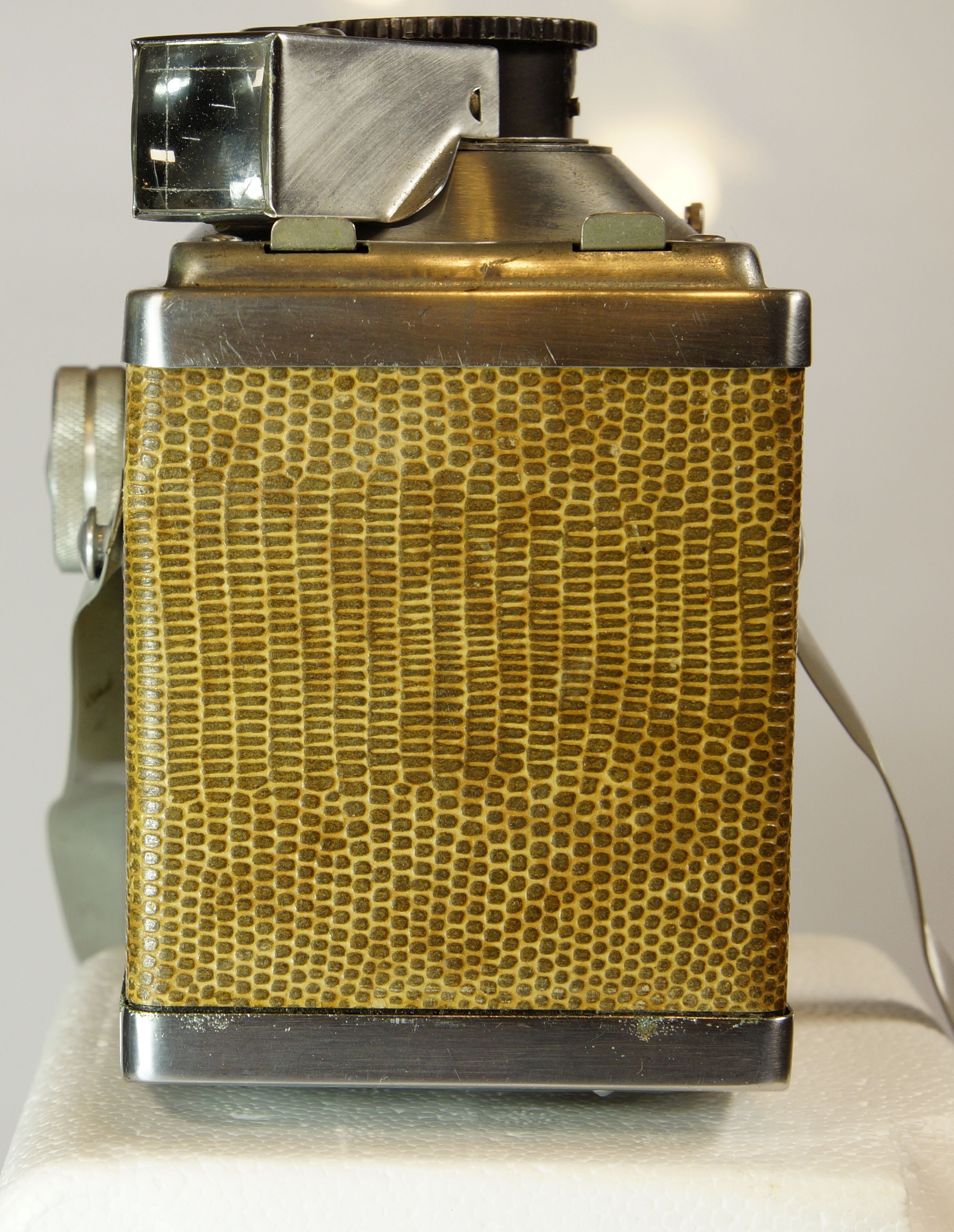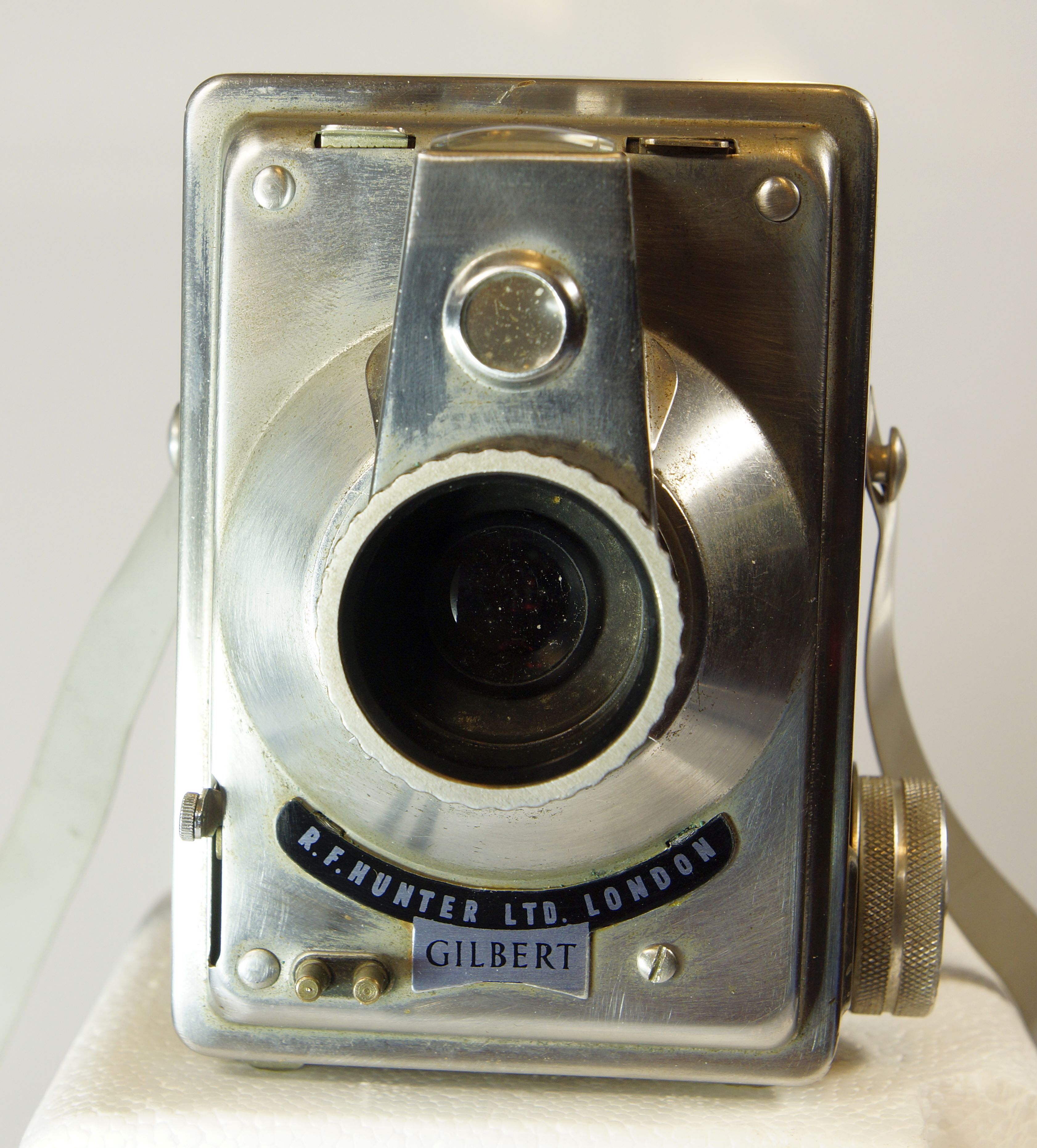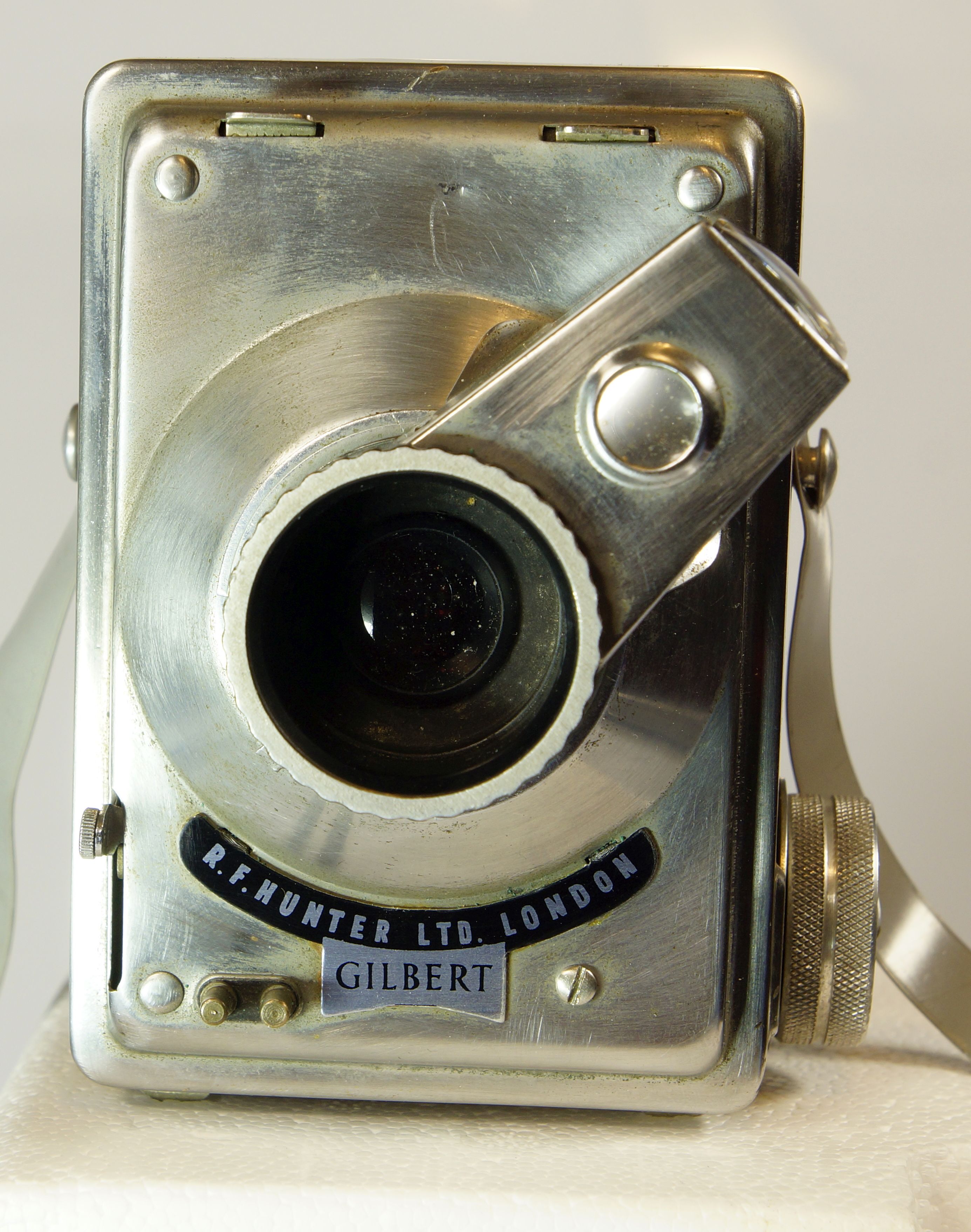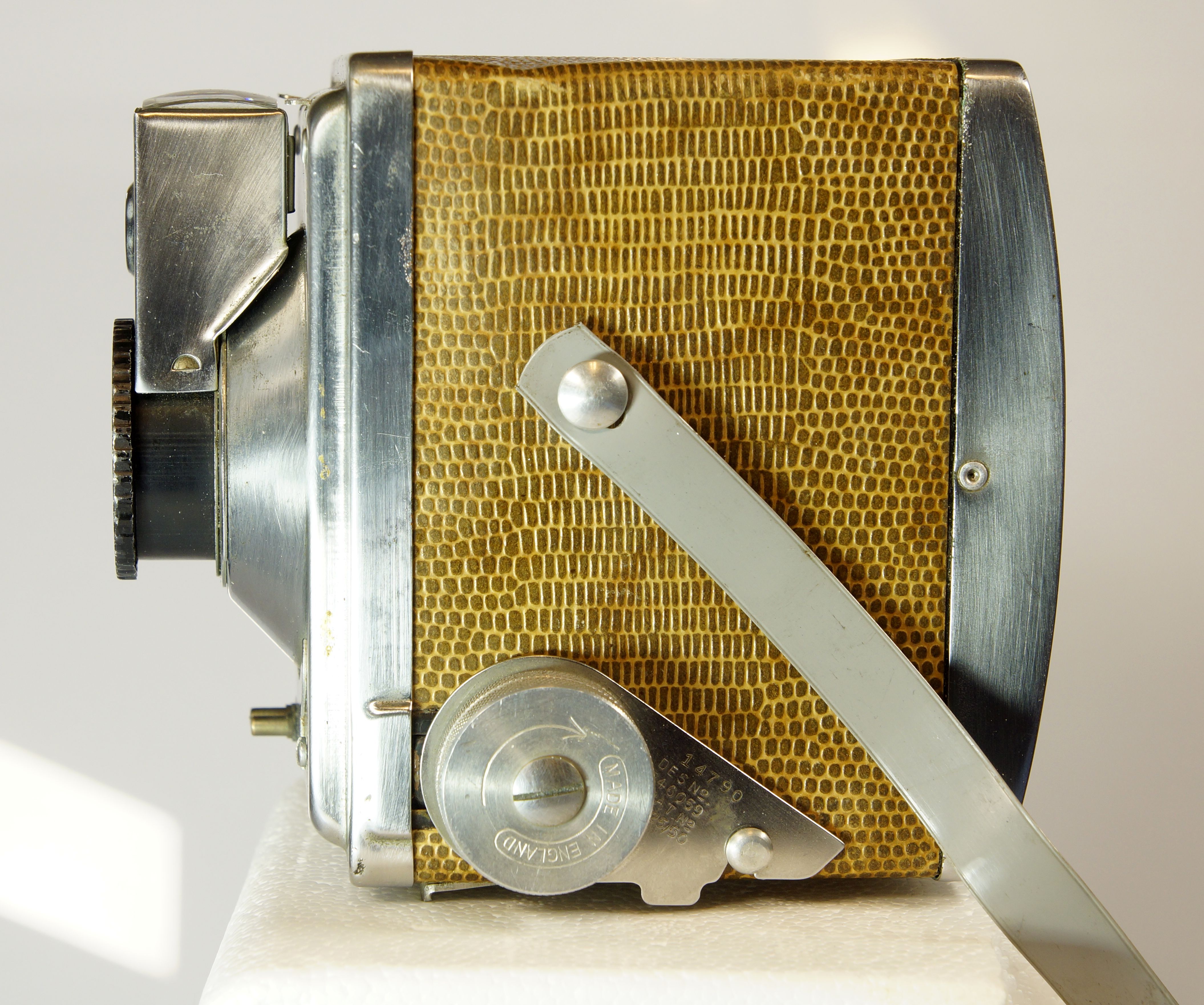 Es geht um die Gilbert Box von R.F. Hunter LTD London von 1953. Die Box ist in einigen Dingen absolut einzigartig, so ist etwa der Sucher um das Objektiv drehbar, von Hoch- in Querformat. Auch die Optik aus gebürstetem Stahl und Schlangenleder ist sehr speziell, ebenso wie das Öffnen, der Hebel am Transportrad ( das übrigens auch den Verschluss spannt ) wird nach oben gedrückt, dann lässt sich der hintere Teil herausziehen.