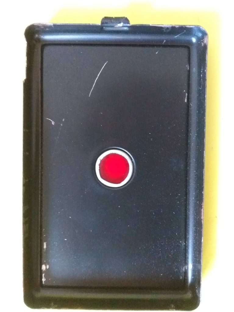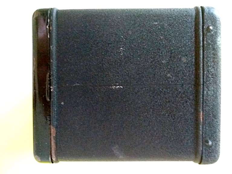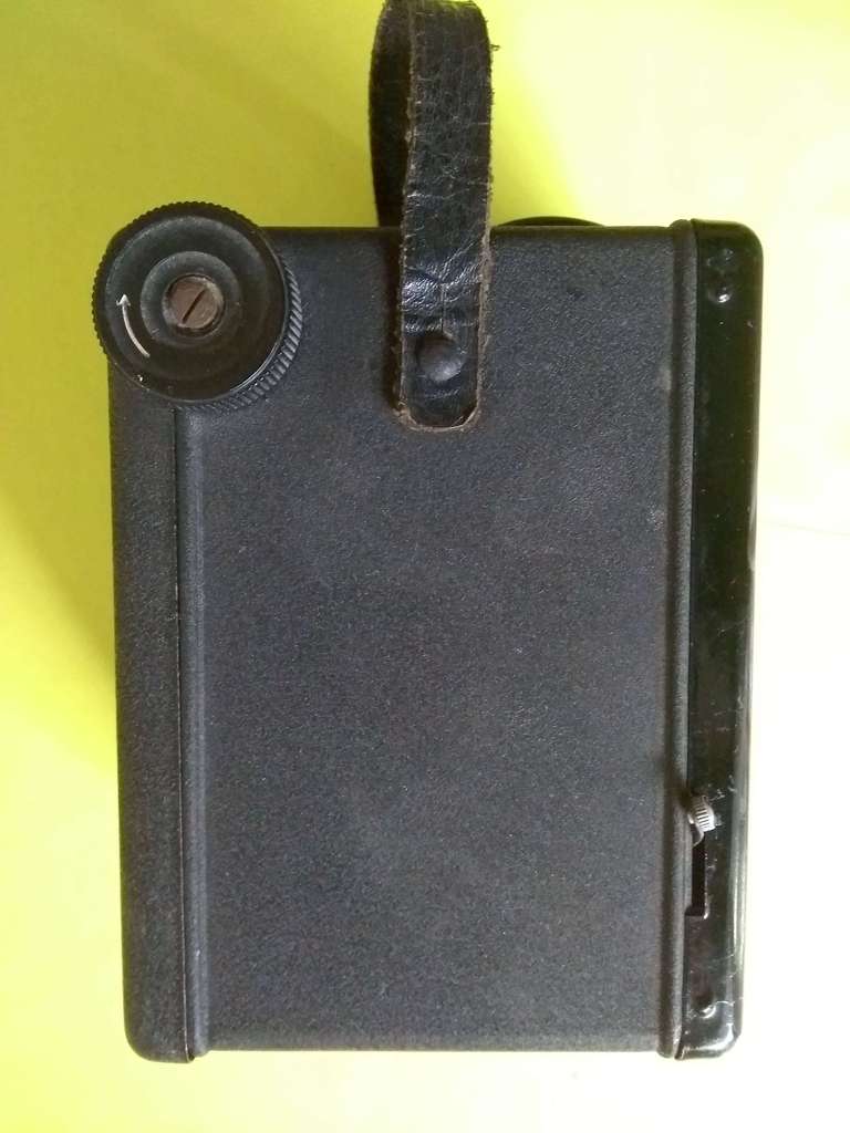Erstaunlich, daß an der 65-69 Jahre alten Kamera der Trageriemen noch fest ist. Am rechten Rand sieht man, daß auch der Vorderdeckel der Kamera mit den beiden Objektiven einfach aufgesetzt ist, fixiert durch vier gepunzte Erhebungen, wie der Deckel einer Blechdose.