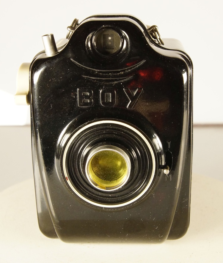 Variante 1: Boy aus Bakelit für 127 Rollfilm, mit M/B als Geschwindigkeiten, Auslöser seitlich ohne Stativgewinde. Baujahr 1949 ( 2te von links)
