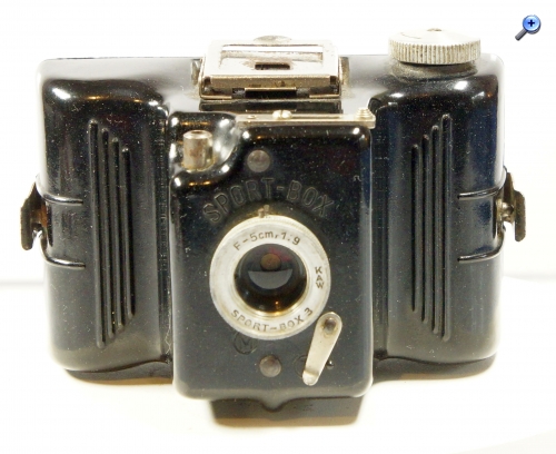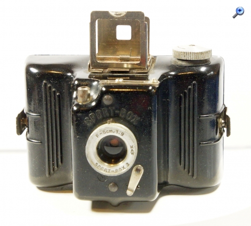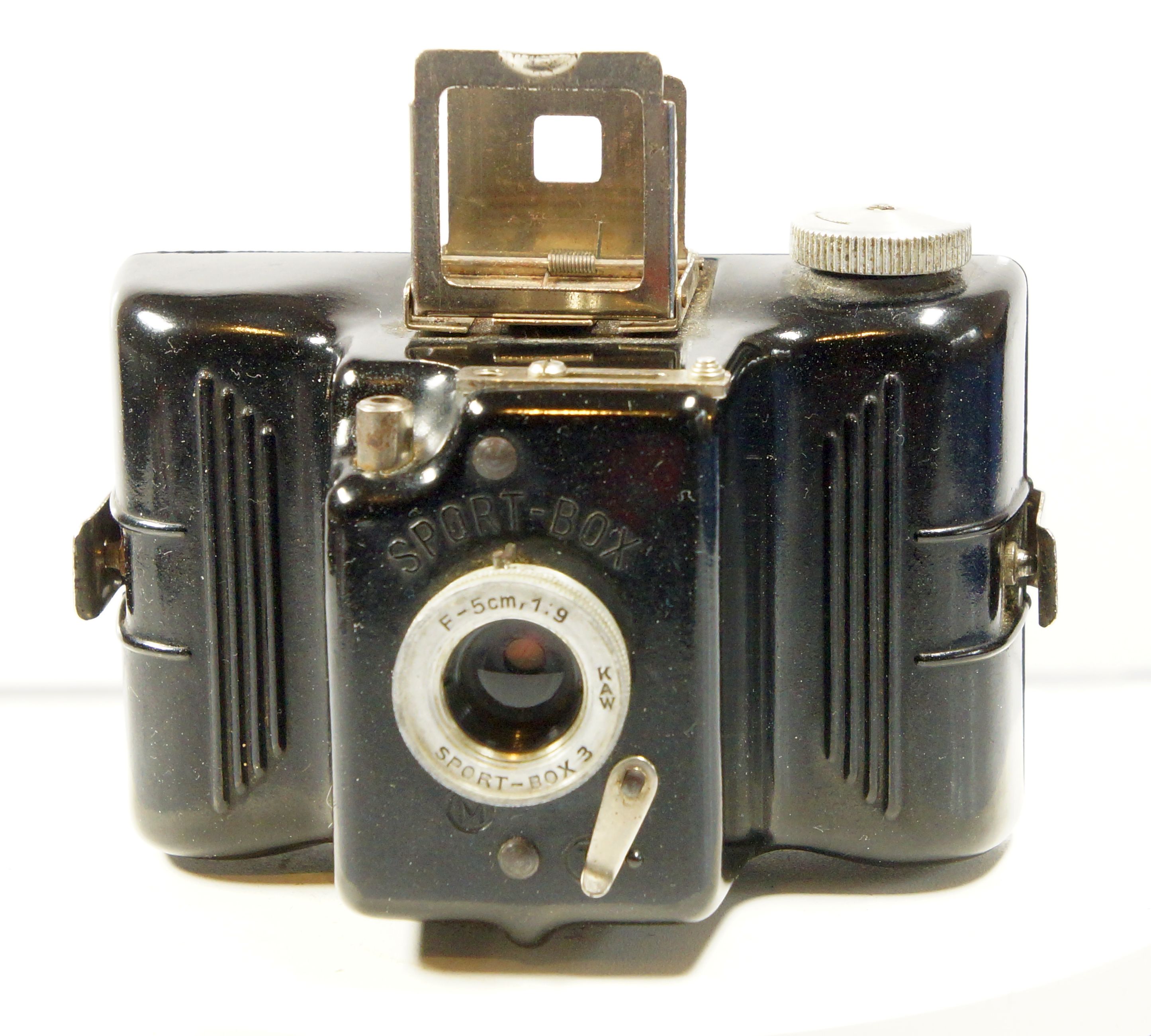 Hersteller, Modell: Kamera und Apparatebau Wien, Sportbox 3 Baujahr: 1950 Fokus: von 1,5m- unendlich Blende: 9 Geschwindigkeiten: M und T Film: 127 Rollfilm Format: 4 x 4 Ein Stativgewinde Auslöseschutz Verschließbares Filmfenster