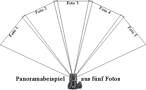 Wenn sie den Aufnahmewinkel Ihres Objektivs nicht kennen oder keine Gradeinteilung an Ihrem Stativ haben, können Sie sich, beginnend von links, jeweils ein Objekt ganz rechts im Bild merken und dann nach der Aufnahme soweit schwenken, das das Objekt nun ganz links im Bild ist. Sie nehmen nun nach und nach mehrere Aufnahmen auf, bis Sie das gewünschte Panorama abgefahren haben. Aus den einzelnen Aufnahmen entsteht später durch Kombination mit dem Panoramaprogramm ein Panoramabild. Dazu beachten Sie die Anleitung der Software.
