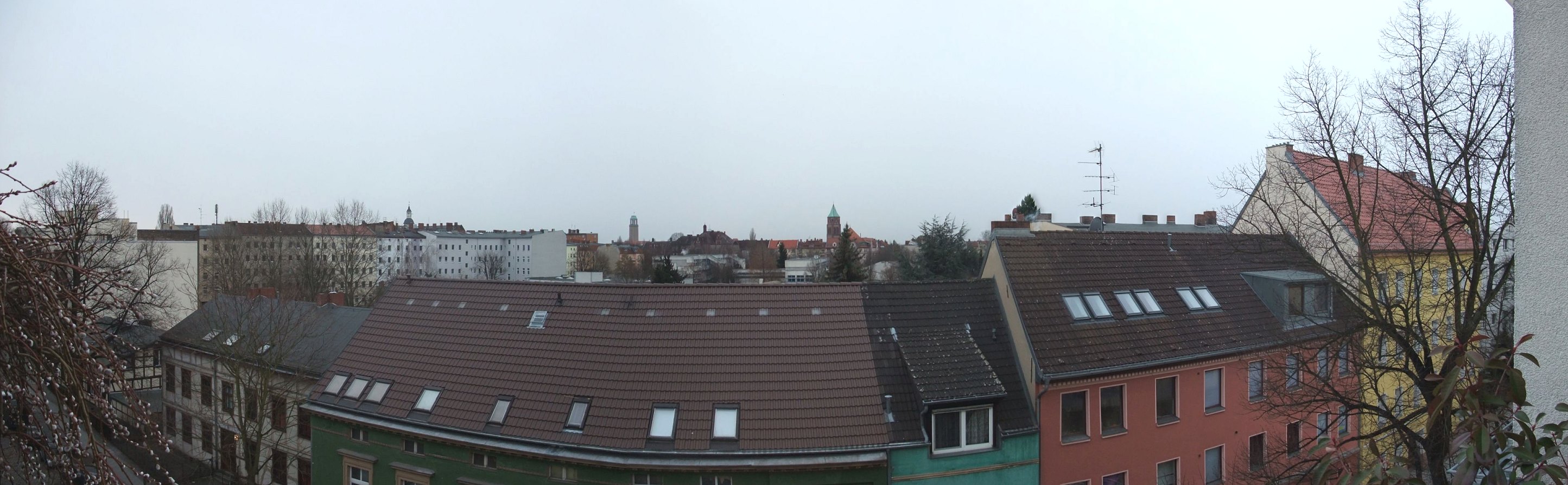 Ich nur drei Photos genommen. Außerdem habe ich bewusst unsymmetrisch weiter geschwenkt und auch noch Höhensprünge verursacht. Dafür ist das Ergebnis recht ordentlich mit Autostich. An der unteren Dachkante in Bildmitte sieht man aber natürlich den Knick-Sprung in der Linie.
